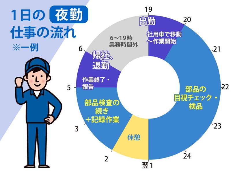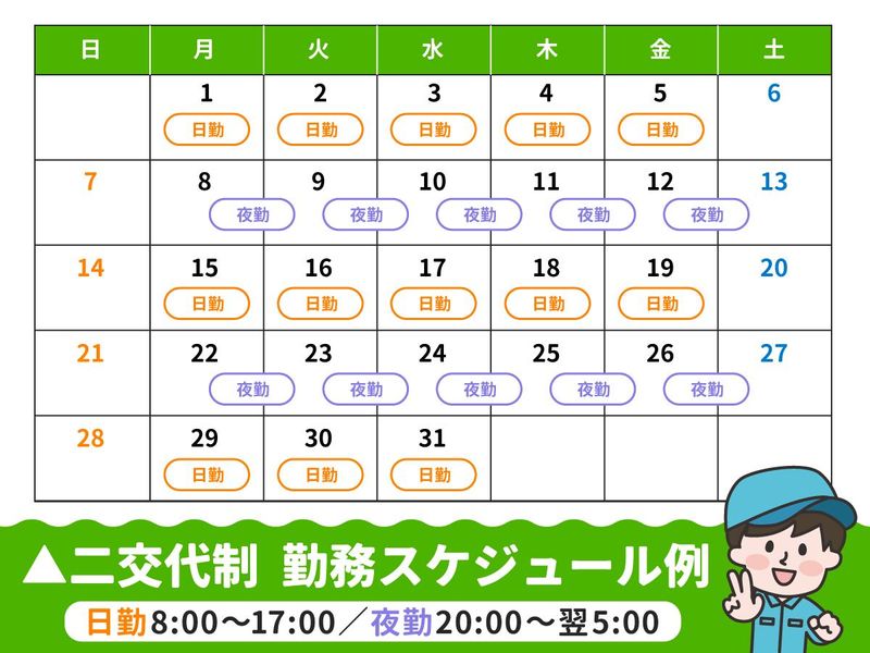 勤務時間 | 固定時間制 勤務時間詳細 総労働時間:1ヶ月あたり160時間 2交替制の勤務形態となります 日勤/8:00~17:00 夜勤/20:00~翌5:00 ※実働7時間50分・休憩1時間 ※お客様先からのご依頼により若干の変動あり <シフト例> ・1週目は日勤 ・2週目は夜勤 のように週単位での交代制です。 「日勤明けで夜勤…」といった事はありません! |