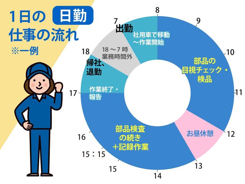 職種/仕事内容 | 仕事内容 *\*\ 積極採用&大量採用実施中 /*/* 「小さな作業」が「大きな安心」に。 ―――――この求人のPOINT――――― ・年間休日121日+有給100%推奨 ・土日休み×大型長期連休 ・未経験&無資格から始められる! ・接客なし&コツコツ黙々作業 ・面接1回のみ&入社時期もご相談OK! ―――――――――――――――――― 顧客先へ訪問し、 産業用機械に使われる 小さなネジやナットの部品を “コツコツ黙々”目視チェックする シンプルな軽作業のお仕事です。 <具体的なお仕事内容> ・小型部品のキズ・割れの確認 ・不良品と良品の仕分け ・チェック項目に沿った目視検査 ※色を目視確認する作業があります 【STEP1】 検査・検品する部品(ネジやナットなど)の 傷や割れがないかを1つずつ目視でチェック! 【STEP2】 傷がないもの(=良品)は”緑の箱”へ 傷や割れがあるもの(=不適合品)は”赤の箱”へ 【STEP3】 最終的に良品・不良品の個数を数えて 報告書に数を記入しておしまい! <1日の流れイメージ(日勤シフト)> ・7:00/営業所へ出勤!社用車で現場へ移動します。 ・8:00/顧客先へ到着したら、作業スタート! 一定数をコツコツチェック ・昼休憩(1時間) ・13:00/検査の続き+簡単な記録作業 ・17:00/片付け+業務報告をして作業終了! ・18:00/営業所へ戻り、翌日の作業内容を確認したら退勤! お疲れさまでした◎ <1日の流れイメージ(夜勤シフト)> ・19:00/営業所へ出勤!社用車で現場へ移動します。 ・20:00/顧客先へ到着したら、作業スタート! 一定数をコツコツチェック ・昼休憩(1時間) ・2:00/検査の続き+簡単な記録作業 ・5:00/片付け+業務報告をして作業終了! ・6:00/営業所へ戻り、翌日の作業内容を確認したら 退勤!お疲れさまでした◎ ※移動時間は”移動手当”が発生します <このお仕事のやりがい> ■■黙々と集中して取り組める達成感!■■ 周りと無理に会話する必要がなく、 決められた作業にコツコツ向き合えます。 目の前の部品を丁寧に確認していくほど、 自分のペースで「できること」が 増えていく手応えを感じられます。 ■■自分の作業が製品の品質を守る重要な役割に■■ あなたが不良品を見つけることで、 お客様のところに届くトラブルを防ぎます。 小さな作業が大きな安心につながるため、 裏方として会社の品質を支える責任と誇りを実感。 ■■変化が少なく安定した環境で働ける■■ 扱う部品は軽量で覚えることも明確。 同じ流れを繰り返すルーチンワークに近いので 「慣れれば慣れるほど楽になる」仕事で、 自分のペースを大切にできることもやりがいの1つです。 <作業する環境について> ・室内作業が中心で天候に左右されにくい♪ ・少人数で落ち着いた雰囲気の職場 <サポート体制もバッチリ> 入社後、まずは2日間の座学研修で 様々な検査・検品方法を勉強できます。 慣れるまではリーダークラスの 先輩社員と同行し実務を覚えます◎ サポート体制バッチリなので 製造職の未経験の方や 社会人経験がない方、浅い方でも 安心してご応募してください◎ |