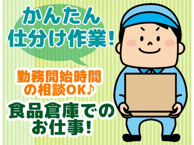 職種/仕事内容 | 仕事内容 <倉庫内仕分けスタッフ募集!> 経験不問!仕分けの経験がなくてもOK! 20代~40代の男性スタッフ活躍中! <お仕事内容について> 食品を扱っている倉庫にて、 パレット積みされた商品を パネルに表示された個数分 格納するカンタンな仕分け作業です。 かんたんな繰り返し作業です。 難しい仕事ではありません。 仕分けが未経験の方や、 倉庫での勤務経験がない方でも 安心して働けます! <おすすめポイント> ・日勤勤務! ・勤務開始時間の変更OK 例)7:00~16:00、9:00~18:00など ・週休二日制! ・未経験OK! ・20代~40代の男性活躍中! ・マイカー・バイク・自転車 通勤可能!駐車場有! <未経験OK> 倉庫内作業未経験の方、 異業種からの転職もOK! しっかりとした研修もあるので、 安心してはじめられます! パート・アルバイト・ 未経験・フリーターOK! 20代~40代の男性活躍中! <こんな方におすすめ> ・すぐに働きたい方 ・日勤専属で働きたい方 ・もくもく作業が好きな方 <充実した研修有> しっかりとした研修あります。 分からないところは先輩スタッフが フォローしてくれるので、安心してください。 質問がいつでもできる環境なので スキルアップも可能です! 倉庫内作業に興味のある方、 派遣のお仕事をお探しの方は お気軽にお問い合わせ下さい。 あなたのご応募お待ちしております。 |