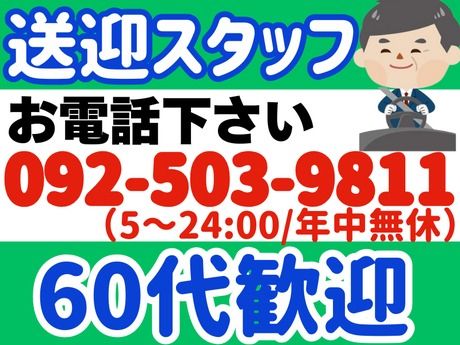 職種/仕事内容 | 仕事内容 【仕事内容】 ラウンドワン(アミューズメント施設)利用者の方を 駅~施設まで、無料シャトルバスで送迎するお仕事です。 [送迎区間] 博多駅(筑紫口)~ラウンドワンスタジアム博多・半道橋店 約10分の距離です! 運行スケジュールのイメージは 画像の4枚目を確認ください。 [必須資格] 中型限定解除免許または大型免許 [使用車両] 画像2枚目のラウンドワン専用マイクロバス(AT車) 【勤務時間】 (平日)13:15~23:50 (土日祝)7:15~23:50 上記、時間内でシフト制となります。 [勤務日数] 週3日程度 [運行スケジュール] 画像4枚目のイメージ画像を確認ください。 利用者さまが乗車するまでの合間時間は 水分補給をしたり、 リラックスして過ごして頂いて問題ないです◎ 【給与】 月給22万9898円 (1時間あたり1900円(一律業務手当含む)) [60代のスタッフが活躍する理由] ・週3日勤務で無理なく働ける ・勤務時間は少しながいですが 1本あたりの運行時間は10分程度! 気楽な時間が多いです♪ ・しっかり稼げる月収22万円以上 ・直行直帰で効率よく通勤(通勤の負担少ない) 車通勤OK 【でんわ応募大歓迎】 お電話応募 092-503-9811(5:00~24:00/年中無休) 少しでも気になったら電話1本で応募★ \60代の方が多数活躍中!/ 定年69歳まで安定してお働きいただけます◎ また、その後の継続についてもご相談に応じます! 【サポートもしっかりします】 ・急な体調不良でのお休み ・万が一のトラブル時も担当者が迅速対応 など、 あんしんしてお仕事していただける体制が 社内で整っています。 [業務委託について] 「業務委託」とは、簡単に言うと自営業者として働くスタイルです。 ※社会保険について 国民年金・国民健康保険にご自身で加入いただきます。 (会社の社会保険に加入はしません。) ※税金について 確定申告が必要ですが、税理士サポートがございます。 |