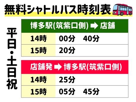 勤務時間 | 勤務時間 【1号車】 (1) 平日/13:15~23:30 (2)土日祝/7:15~12:30 (3)12:30~23:30 【2号車】 (3)平日/13:35~23:50 (4)土日祝/7:35~12:50(5)12:50~23:50 *(1)~(6)のシフト制 *週3日程度 ※1台増便につき新規運転スタッフ様3名募集!! |