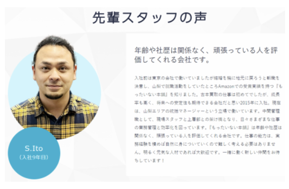 選考プロセス | 選考プロセス ⭐選考フロー⭐ ──────────────── 【会社概要】 ● 企業名: 古本買取通販ドットコム株式会社 (屋号:もったいない本舗) ● 事業内容: 本、CD、DVD、ゲームソフトの買取と販売 ● 所在地: 〒402-0025 山梨県都留市法能659-4 ● 会社URL: https://www.furuhonkaitorituhan.com/ - /////////////////////////////////////////////////// 【応募方法】 ①WEBからの応募 (1分で応募が完了します!) または ②電話でのお問い合わせ (採用担当: 050-2018-7237宛に お問い合わせください) ※面接は随時行っております。 /////////////////////////////////////////////////// 履歴書の有無:任意 |