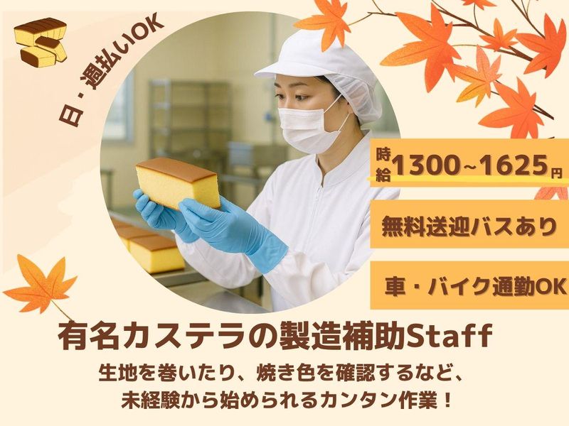 職種/仕事内容 | 仕事内容 あの!有名なカステラなどの製造工場で あま~い香りがする中でのオシゴト♪ 【この求人Point】 ✨2つの時間帯を選べる! ✨週4日~勤務OKで無理なく働ける♪ ✨車・バイク通勤OK&無料送迎バス有で 通勤もラクラクです! ✨ご自宅近くで出張面談対応も可能です! 【具体的には】 生地を巻いたり、焼き色を確認するなど、 未経験から始められるカンタン作業! また、包装後のカンタンな検品や仕分け 作業などもお任せいたします! 20〜60代までの男女スタッフが活躍中! コツコツ作業が好きな方にピッタリです! 【入職前の不安もご安心ください】 「製造は初めてで不安…」という方も大丈夫! 扱うのは軽い食品のみ、体への負担も少なめです。 制服や安全靴は無償貸与されるので、準備ナシで 始められるオシゴトです◎ 職場は清潔&空調完備で、快適に作業ができます! ※人気なご案件になりますので お早めにご応募ください。 人員が充足次第募集終了となります。 |