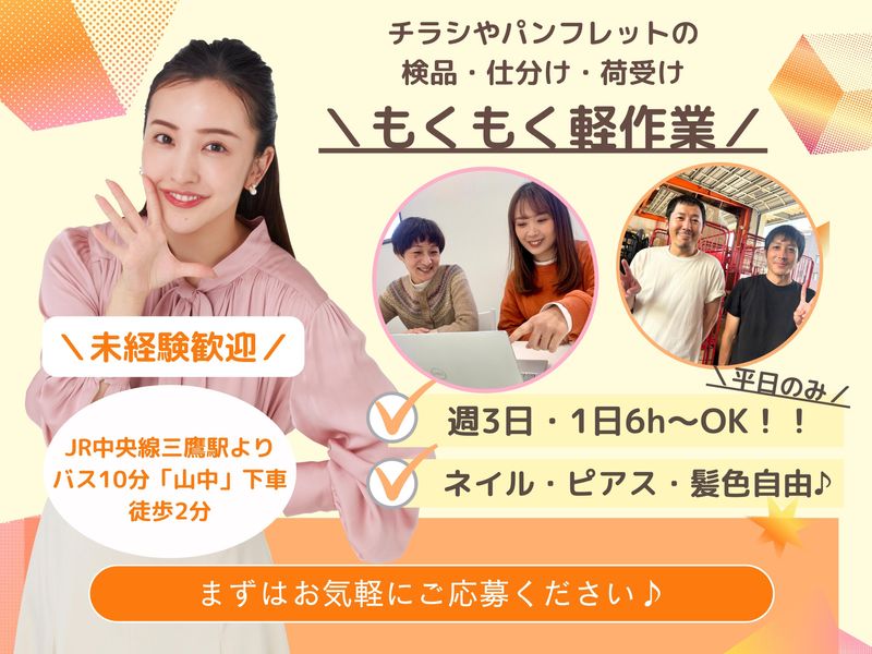 職種/仕事内容 | 仕事内容 \モクモク軽作業のお仕事!/ ==================== 〈この求人のおすすめポイント!〉 ✅週3日・1日6時間~OK ✅柔軟シフト♪扶養内勤務も可能 ✅髪型・ネイル・服装自由でおしゃれOK ✅時給1,230円~/月収19万円以上も可 ✅正社員登用あり&スキルアップ支援も充実 ✅残業ほぼなし!プライベートと両立可能 ==================== 【具体的な業務内容】 チラシやパンフレットの ・印刷 ・確認、検品 ・仕分け、発送準備 など ✅シンプル作業で未経験も安心! ✅立ち作業あり・モクモク作業中心! ✅荷物は軽い物から重い物まで様々! ※重いものは、複数人で一緒に運ぶのでご安心ください♪ ≪とある1日の流れ≫ 11:00⇒今日の流れを確認!荷受け準備 12:00⇒ チラシやパンフレットの検品・仕分け作業 14:00⇒お昼休憩♪ 15:00⇒発送する紙の管理・荷受け作業 18:00まで⇒紙の荷受け・検品・仕分け・倉庫内の片づけ 簡単なシンプルな作業なので、 すぐに覚えることができます! 慣れるまで先輩が優しくフォローするので 気軽に相談しやすい環境です! (変更の範囲) 当社業務全般 |