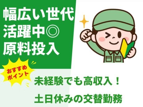 職種/仕事内容 | 仕事内容 【仕事内容】 \きれいな工場でのカンタン軽作業♪/ ◎──────────────────────────◎ スコップで原料を機械に入れるだけの簡単作業 未経験スタートの方が多数活躍中です! ◎──────────────────────────◎ 《原料の投入作業(交代勤務)》 ◇仕事内容 自動車のエアバッグが作動する際に使われる、 燃料の原料を製造している大手企業でのお仕事です。 ●袋に入った原料をスコップで機械へ投入する作業 →スコップを使って投入するので、 体にかかる負担はほとんどありません! 重いものを持つことは基本ありませんが、 ●不具合時などに限り、10kg程度の移動作業が発生することもあります。 製造工場での勤務経験や車の知識は不要です。 未経験の方でも、安心して始められます! (雇入れ直後)上記のとおり (変更の範囲)会社の定める業務 ◇職場環境・設備 ・清潔感のあるきれいな工場 ・交代勤務でしっかり稼げます ◇この仕事の魅力 ・20代~60代までの幅広い世代が活躍中! ・未経験OK!体力的な負担が少ない作業です ・来社不要で面接OK!WEB・電話で登録可能 \職場見学も実施中!お気軽にご応募ください♪/ \お仕事スタートまでしっかりサポートします!/ 【こんな方にオススメ】 ・セカンドキャリアとしてのお仕事をお探しの方 ・フォークリフト免許をお持ちの方 ・高収入・高時給のお仕事をお探しの方 ・商品検品・仕分け・ピッキングなどの倉庫内作業の経験を活かしたい方 ・梱包・包装・組立・加工などの工場製造の経験を活かしたい方 ・検査・充填・品出しなどの機械オペレータの経験を活かしたい方 ・食品工場(肉・鮮魚・野菜・惣菜)での盛り付け・調理・材料カットの経験を活かしたい方 ・経験が浅いけどスキルアップしていきたい方 ・力仕事に抵抗のない方 ・寮完備や送迎があるお仕事を探している方 |