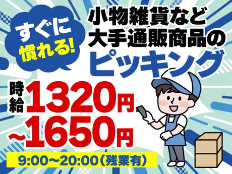 職種/仕事内容 | 仕事内容 【すぐに慣れる!小物雑貨など大手通販商品のピッキング】 人気の日用品を取り扱うシンプル作業◎ 業績好調な大手通販商品の、仕分けやピッキングをお任せします。 派遣の仕事や、倉庫作業が初めての方も大丈夫! 未経験の方でもすぐに慣れるシンプル作業♪ 軽い商品ばかりなので負担もありません! 男女問わず50代まで幅広い年代の方が活躍中! ★即日勤務可能な案件有! |