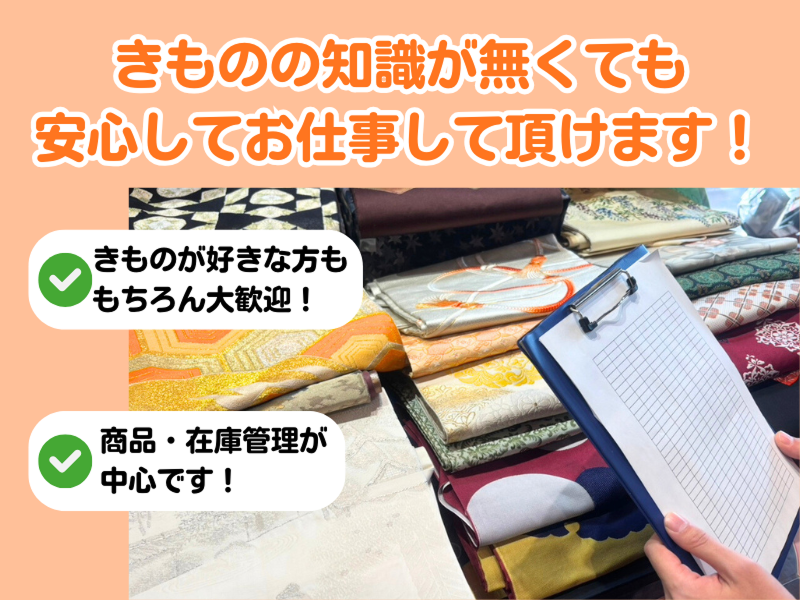 職種/仕事内容 | 仕事内容: ⋆˖✧⋆˖✧⋆˖✧⋆˖✧⋆˖✧ ・駅前徒歩1分のオフィスビル内での勤務です ・土日祝お休み、年間休日125日以上! ・正社員登用制度あり ・産休育休取得&復帰実績あり ⋆˖✧⋆˖✧⋆˖✧⋆˖✧⋆˖✧ 当社はきもの販売店や写真スタジオなど事業展開をしており、商品部にてPCを使用し商品・在庫管理業務を担っています。多くの商品を取り扱う中で、より安定した管理体制を整え、業務の質を高めていくことが重要だと考えています。そこで今回、 在庫管理体制の強化および、データ管理の精度向上を目的に、商品管理スタッフを募集します。 《仕事内容》 ・PCを使用した在庫管理、データ入力 ・商品の入出庫管理 ・商品の整理 ・保管 ・催事開催時の現場での在庫管理 ・商品管理業務 ※商品を持ち運ぶ作業があり、重たいものを扱う場合があります |