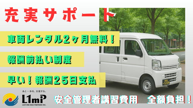 その他 | 職種 軽自動車ドライバー 雇用形態 業務委託 【車両貸与あり】 ●車両をお持ちでない方に、車両貸与制度あり ・初回2ヶ月無料! ※弊社規定条件有 ・3か月目〜30,000円/月(税抜)で安価に貸与可能 面談時に軽貨物車両の有無を確認させていただいております。 ※任意保険は個人加入となります ●黒ナンバーの車両をお持ちの方は、持ち込みで稼働できます! 持ち込みで稼働された方にはガソリン代キャッシュバック★ (※弊社規定あり、上限有り) 【企業概要】 <株式会社ラストワンマイル・パートナーズ> 【所在地】 〇本社 〒103-0006 東京都中央区日本橋富沢町9-19 住友生命日本橋富沢町ビル7階 〇事務所 〒103-0013 東京都中央区日本橋人形町3-11-7 THE CORNER日本橋人形町3階 TEL:03-4333-1616 【事業内容】 〇自動車の販売・リース事業 〇貨物軽自動車運送事業 〇各種事業におけるコンサルティング事業 【社員数】1,078名(グループ合計) 2025年5月現在 グループ合算売上は、お陰様で右肩上がり! |