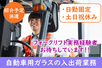 【紹介予定派遣】月収29万円以上可能!飯能駅から徒歩5分!自動車硝子の入出荷業務!フォークリフト実務経験者活躍中!大人気の日勤専属!エリア高時給1400円!うれしい土日祝休み!