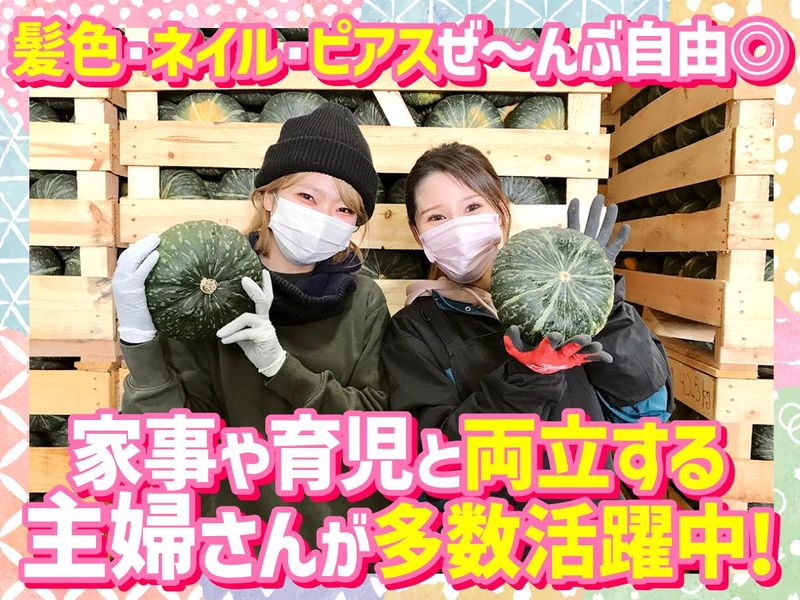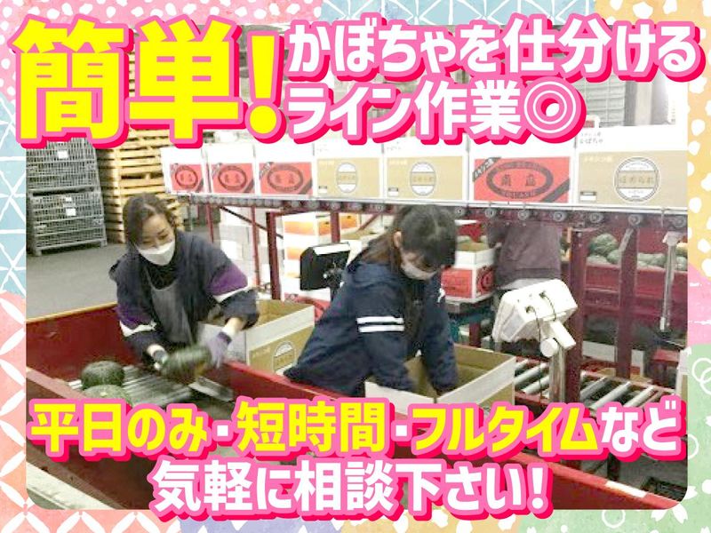 職種/仕事内容 | 仕事内容 ✅高時給1250円!週2~OK! ✅フルタイム&扶養内歓迎!働き方相談OK ✅髪色・ネイル・ピアス全部自由♪服装も! ✅屋外作業無し!カンタン軽作業!未経験OK \お仕事内容は…/ 大手スーパーにお届けする 生鮮食品(主にかぼちゃ)の箱詰め作業。 とにかく段ボールに詰めるだけ! ラインに流れてきたかぼちゃをとって、 1箱ごとの重さが均一になるように詰めていきます。 その他、段ボールを組み立てる役、 出来上がった商品を運ぶ役、など みんなで分担して1つの商品を完成させていきます。 ■箱詰めについて ・かぼちゃの重さ:1~2キロ ・詰めた箱の重さ:約10キロ かぼちゃなので箱はやや重めですが、 手で運ぶことはほとんどありません。 主婦パートさんが多数活躍中です! \こんな方にピッタリ!/ コツコツもくもく作業が好きな方 接客業がニガテな方 体を動かすのが好きな方 \取扱商品について/ エム・ヴイ・エム商事六甲パックセンターでは、 かぼちゃをメインに扱っています! その他、季節によっては枝豆やアメリカンチェリー、 ブルーベリー、きのこ類などの箱詰めも行っています。 皆さんに箱詰めしていただいたかぼちゃなどの食品は、 大手スーパーに届けられ、販売されます◎ |