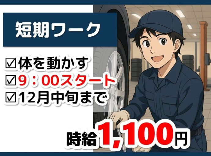 職種/仕事内容 | 仕事内容 【 タイヤ交換補助スタッフ募集(短期)】 12月中旬までの短期のお仕事! 自動車整備工場で、タイヤ交換の補助作業をお任せします。 難しい作業は一切なし!体を動かすのが好きな方にぴったりです。 50代後半までの男性スタッフが多数活躍中! ▍お仕事内容 ……………………………………… タイヤの運搬・積み下ろし → 車や作業場へのタイヤの出し入れ タイヤ交換の補助 → 専門スタッフが交換する際のサポート(工具の受け渡しなど) 清掃・片付け → 作業場の整理整頓、交換後のタイヤ整理など 専門的な整備スキルは不要! 短期間でしっかり稼げる体を動かすお仕事です ▍ここがポイント ……………………………………… ✨ 12月中旬までの短期集中ワーク ✨ 未経験でもOK!社員さんが丁寧にサポート ✨ 屋内外での作業で動きのある仕事 ✨ 体を動かして働きたい方におすすめ ✨ 20代~50代後半の男性スタッフが多数活躍中 ▍NCIで働くメリット ……………………………………… 担当営業がしっかりフォロー 社会保険完備(条件を満たせば即日加入OK) 誕生日やイベントでプレゼントあり ☕ 定期フォローありで安心勤務 |