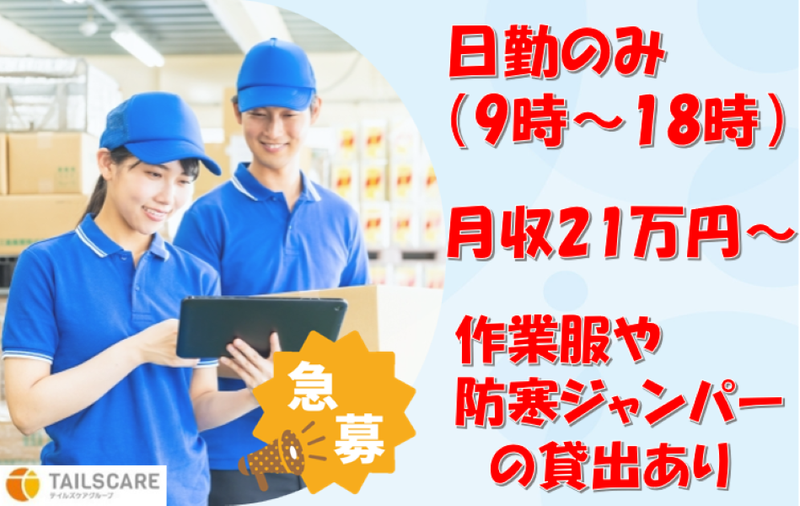 対象となる方 | 求めている人材 ・20代・30代・40代・50代まで、幅広い年代のスタッフが活躍中! ・ルーティン作業が好きな方 ・モクモク作業や単純作業が得意・探されている方 ・冷暖房の影響が少ない環境で働きたい方 ・安定した収入(総支給21万円以上)で、短期間就業希望の方! |