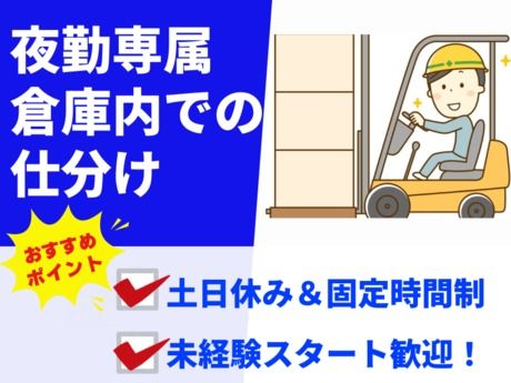 職種/仕事内容 | 仕事内容 \ここがポイント/ ★夜勤専属で効率よく稼げる♪ ★月収24万円以上も可能!高収入◎ ★車通勤OK!駐車場完備で通勤ラクラク *・。・。*・。・。*・。・。* <仕事内容> \★夜勤専属!倉庫内での仕分け作業★/ ◎倉庫内での荷物ピッキングや仕分け作業 ◎伝票をチェックし、出荷先ごとに整理 ◎パレットへ荷運びを行う場合あり ◎フォークリフト免許保有者は採用面で優遇 ★体を動かして働きたい方にピッタリ★ 未経験の方も始めやすいシンプルな作業です! 駐車場完備なので車通勤もラクラク♪ *・。・。*・。・。*・。・。* |