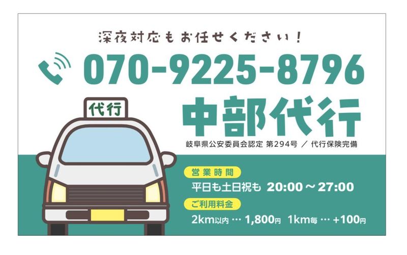 職種/仕事内容 | 仕事内容 ☆――――――――――――――――――☆ 2種免許をお持ちの方向けの求人になります! 代行運転のお仕事をお任せします。 主な待機エリアは柳ヶ瀬、玉宮となります。 ☆――――――――――――――――――☆ \ POINT★ / ■給与は日払い手渡し可能! ■週2日、1日4h~OK♪ ■現在20代~40代まで14名が活躍中☆ ■ペアでやるお仕事なので、 お知り合い・お友達同士の応募も歓迎! ■主婦・主夫さんや学生、フリーターの方や副業としてWワークで働きたい方も歓迎◎ ■最低保証ありで安定収入◎ |