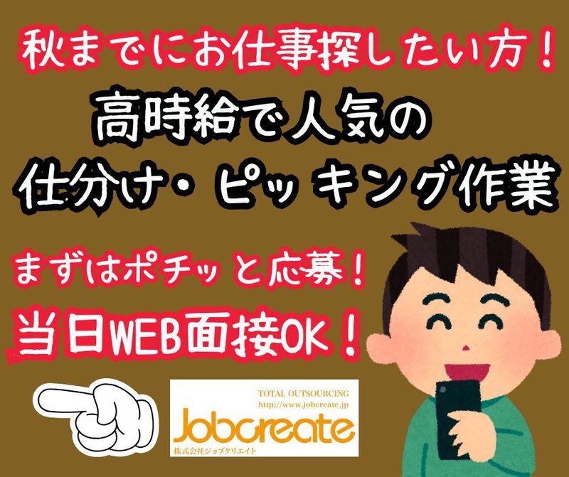 職種/仕事内容 | 仕事内容 No.61078 ◆20代30代40代50代活躍中! ◆当社オープニングスタッフ大募集! ◆無料送迎バス有 ◆週3日~就業可 ◆倉庫内軽作業 ◆未経験者大歓迎 ◆50分ごとに10分休憩有♪ ◆ピッキング・仕分け作業 お仕事内容 ①商品をバーコードで読み取り ②ランプが光り、個数がでてくるので その場に食品を持っていき箱に詰める ③箱が一杯になったら 指定の場所へ台車を使用して移動 作業内容はたったこれだけ!! 難しいことも何一つもないです♪ 商品もコンビニの唐揚げや・冷凍食品なので 重たい物は基本ありません♪ この夏嬉しい、冷蔵・冷凍倉庫で 涼しい環境でお仕事していただけます♪ ◇アピールポイント◇ 周辺に常に社員の方がいるので わからなくなったらすぐに聞ける環境です♪ 無期雇用で長期的に就業していただけます! この夏嬉しい、冷蔵・冷凍倉庫内作業♪ ◇職場環境◇ 男性・女性7:3の男女比率となります ◇休憩室あり ◇更衣室あり ◇自販機あり ◇喫煙所あり ◇防寒具(上下作業着)貸出あり ◇勤務形態◇ ①12:00~21:00 ②12:45~21:45 休憩60分 8H労働 ◇月収例◇ 8H労働の場合 1500円×8H×21日=252000円+交通費全額支給 お気軽にお問い合わせ、ご応募くださいね(^O^)/♪ ◇交通費◇ まずは通勤方法をご相談ください! *公共交通機関の場合:原則 交通費全額実費支給 ******************** 当社までご来社いただかなくても面接が可能な スマホのWEB面接を導入しております。 テレビ電話のような形で面接をさせていただきます。 難しい操作は一切ございません。 スマートフォンやタブレットなどで ご自宅やお好きな場所にいながら お好きな時間に面接が可能です。 安心していただけるように 丁寧に対応させていただきます♪ お気軽にお問合せください♪ |