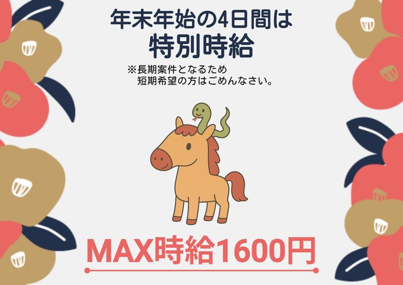 職種/仕事内容 | 仕事内容 \ 年内にお仕事スタート! / 年末年始は、通常時給より 『200~300円UP』と、 ちょっと嬉しい特別期間♪ 【 年末年始の特別時給 】 ・12/29~31:時給1500円 ・1/3:時給1600円 通常時給:1300円 ※高校生・大学生・平日のみ 時短・週1日勤務 ――時給1250円 ★☆★☆★☆ 〈注意〉 ☆★☆★☆★ 今回の募集は 長期勤務可能な方が対象です。 「年末年始だけ出たい!」 という短期勤務はごめんなさい…! 長期で入ってくれる方大歓迎です♡ ★☆★☆★☆★☆★☆★☆★☆★☆★ ◎週2日~OK(学生は週1日~OK) ◎週ごとのシフト制 ◎服装自由&空調完備 ◎未経験さんも経験者さんも歓迎 ◎20代~50代前半の女性多数活躍中 ◆お仕事内容◆ 軽い商品のピッキング お買い物気分で、 棚から“ポンッ”と商品を集めて 台車でコロコロ~♪ 扱うのは軽い日用品なので 身体への負担も少なめ。 初めての方でも、 手順を覚えればすぐ慣れます◎ ▼基本の流れ 1)指示書を確認 2)棚から商品を取り出す 3)台車に乗せて指定エリアまで運ぶ たったこれだけ! 空調がきいた快適な倉庫で、 モクモクと進められるシンプル作業。 |
