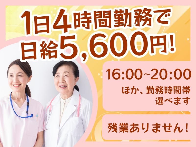 職種/仕事内容 | 仕事内容 \医療業界なら好条件で働けます!/ ⭐1日4時間で日給5600円 ⭐土日祝休みもOK ⭐医療の資格は不問 ⭐夕方からの準夜勤 <具体的な業務内容> 病院病棟にて… ■お部屋のお掃除ちょこっと ■シーツをサッと交換 ■備品をすっきり整理 ■車いすの移動をサポート 軽作業中心で覚えやすいお仕事です♪ 【 柔軟な働き方が可能です 】 ✅4時間だけの勤務! 16:00~20:00の間だけで、 他の時間帯に調整もOKです。 もちろん残業ナシ♪ ✅出勤日数の調整もスムーズ 週5日勤務のうち、平日でも土日でも 曜日固定でもOK! ご都合に合わせて働けます♪ - 「介護の仕事は好きだけど、 人手が足りなくて夜勤ばっかり…」 「看護師、キツくなってきた… 土日祝休みで暦通りの休日っていいな。」 弊社では、こんなお悩みのある 介護業界や医療業界の別職種からの 転職者が多数活躍しています! <1日の流れ(例)> (16:00~)制服に着替えて勤務開始! (17:00~)患者様の搬送や血糖測定セットなど (18:00~)食事の配膳 (19:00~)食事の下膳、口腔ケアの準備など (20:00~)病室清掃、お薬配布などして終了! その日1日のやることは決まっているので あっという間にお仕事が終わるのも魅力◎ さらに働きながら資格取得して スキルアップやステップアップも可能です。 年齢も性別も気にせず 未経験から働ける看護助手のお仕事♪ 気になった方はお気軽にご応募ください! 働くうえで困ったことや不安なこと 勤務条件についてのご相談は あなた専属のコーディネーターが 何でも相談にのります◎ \スタッフインタビュー/ 【50代主婦さん】 以前は介護の仕事をしていました。 夜勤があったり、土日も仕事、 さらに人手が足りなくて残業ばかりで 体力的にきつくなって辞めました。 同じ介護業界で転職を考えていましたが たまたま見つけた看護助手というこの仕事、 まさに私の希望にピッタリの条件でした! ここでなら年金をもらう年になっても 続けられそうです♪ |