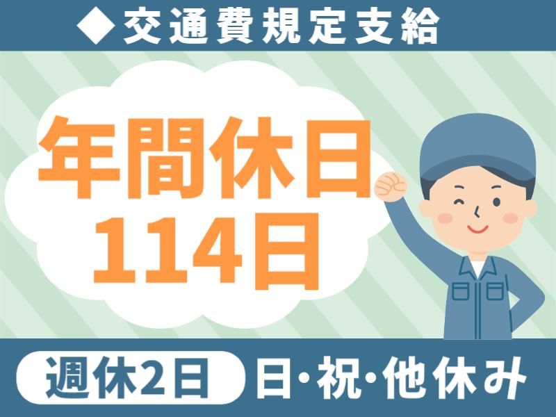 休日休暇 | 休日休暇 完全週休二日制(日曜プラス1日) 原則土日休み、他会社カレンダー、年間休日114日 ※他慶弔休暇、有給休暇、育児休暇などあり |