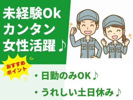 職種/仕事内容 | 仕事内容 \ここがポイント/ ★未経験者歓迎!簡単&軽作業! ★土日休みでプライベートも充実! ★タブレットで作業指示がわかりやすい♪ ★20~55歳の女性が多数活躍中! *・。・。*・。・。*・。・。* <仕事内容> \★自動車部品の箱詰め・梱包作業★/ ・タブレットの指示通りに商品を梱包するだけ! ・自分のペースで進められる個別作業! ・完成品を箱に詰めて準備完了♪ 未経験の方も安心!複雑な工程や重い荷物は一切なし◎ 就業後に業務内容が変わることもありません! 職場見学OK!安心してスタートできます♪ 日勤のみ&土日休みで、家庭との両立もバッチリです! *・。・。*・。・。*・。・。* |