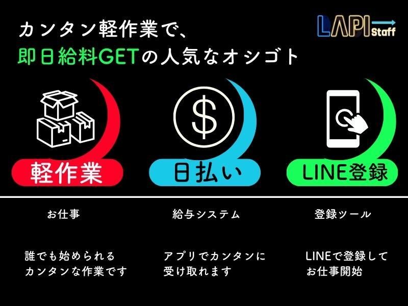 待遇・福利厚生 | 【保険制度】 雇用保険、労災保険、健康保険、厚生年金 【福利厚生】 待遇・福利厚生 【福利厚生】 ■日払い制度あり ■前払い制度あり →LAPI-Staffの日払いは 最短申請即日で受け取り出来ます 土日祝、連休も関係ないのが 嬉しいポイントです ■WEB登録OK ■正社員紹介あり ■有給休暇あり ■履歴書不要 ■社会保険完備 ■交通費の支給 ■研修制度 |