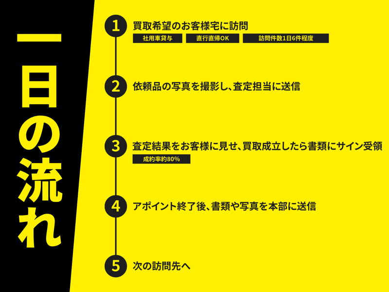 職種/仕事内容 | 仕事内容 買取希望のお客様宅への訪問・査定・買取対応。 広告やメディア戦略により、問い合わせは全国から急増中! 【買取商品の例】 ブランド品 貴金属 家電 楽器 日用品 カメラ …etc 【POINT】 ★飛び込み・テレアポ一切なし ★商品査定は専門スタッフが担当するため、査定スキル不要 ★アポイント設定もスケジュール管理も内勤メンバーが担当 ★月22日出勤すればシフトは自由です。 ★業界平均1日3アポですが、当社では1日6件のアポを用意。 業界平均2.5倍の売上をお給料に反映しています。 【仕事の流れ】 社用車で買取希望のお客様宅に訪問 ・直行直帰OK ・訪問件数1日6件程度 ▼ 依頼品の写真を撮影し、査定担当に送信 ▼ 査定結果をお客様に見せ、買取成立したら書類にサイン受領 ※成約率約80% ▼ アポイント終了後、書類や写真を本部に送信 ▼ 次の訪問先へ 【入社後の流れ】 1週目:座学研修 会社のルールや買取に関する知識などを学習 ▼ 2週目以降:同行研修 先輩社員に同行し、業務の流れを把握 ▼ 3ヶ月後には一人前に 独自の教育体制により、わずか3か月で高収入を狙えるバイヤーへと成長可能。 【手厚い教育・研修体制】 元警視庁警視・櫻井裕一氏による「防犯・危機管理講習」や、「無罪請負人」高橋裕樹弁護士による法務・コンプライアンス研修を導入。 顧客からの信頼を獲得しやすい接客品質を全員が身につけられる体制です。 【キャリアアップ】 事業や店舗をどんどん拡大中。 マネジメントや新規事業など、新しいポジションでキャリアアップできる機会も豊富です。 また、正社員から業務委託に切り替え独立することも可能。 より自由度が高く、やりたいことやライフスタイルに合わせた働き方ができます。 【人生を変えるチャンス】 ・タワマンに住んでみたい ・もっと良い車に買い換えたい ・憧れのブランド品を集めたい ・若くして資産を構築、運用したい ・持ち家を購入したい ・独立起業資金を貯めて独立したい …etc 当社の先輩たちが叶えてきた夢はさまざま。 決して選ばれし一部の人だけではありません。 正しく業界と仕事を選べば、思った以上に叶えやすいのです。 あなたもぜひ、一歩踏み出してみませんか? すぐに入社を決めなくても大丈夫です。 まずはオンライン面接で話を聞き、検討してみてください! |