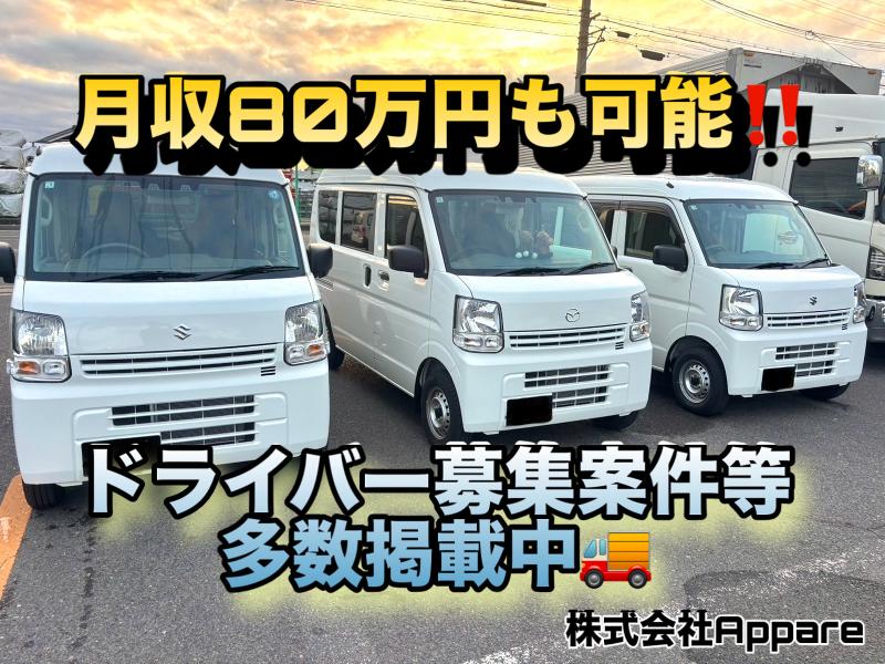 職種/仕事内容 | 仕事内容: ▼個人宅や会社への配達業務をおまかせいたします。 ▼担当エリア制のため、道を覚えやすく、効率よく配達できます。 ▼未経験の方はまず既存スタッフが丁寧にエリア、作業などをレクチャー。 ▼経験者の方は比較的回りやすく、数が多いところを選んでいただけます。 <具体的な業務内容> * 軽バンでの荷物配送 * 荷物の積み込み・配達 * 不在時の簡単な対応 * 配達業務終了の報告 取り扱う荷物は日用品や通販商品が中心です。 ナビ・配送アプリを使用するため、未経験の方でも安心してスタートできます。 宅配ドライバー|1日の売上例 単価:1個 155円 平均配達個数:150個/日 ▲ 1日の売上 155円 × 150個 = 23,250円 155円 × 200個 = 31,000円 ▲1日のスケジュール例 * 8:30 営業所にて積み込み * 午前中〜 配送開始 * 14:00 午後便の積み込み * 17:00 夕方便の積み込み * 20:00 業務終了 勤務時間:8:30〜20:00頃 *だんだん慣れてくれば19:30頃 月収イメージ(参考) * 23,000円 × 22日稼働 = 月収500,000円 * 23,000円 × 25日稼働 = 月収550,000円 * 31,000 円× 25日稼働 = 月収775,000円 ※配達個数・稼働日数により変動あり ▼未経験でも経験者でもその方に合った働き方を選んでいただけるそんな会社です。 ▼車両貸し出しプランも複数ご用意。 |