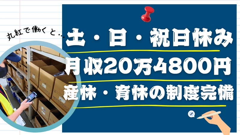 休日休暇 | 休日休暇 土日祝休み ※年1~2回、棚卸のため 土曜出勤の可能性あり 他、 ●産休・育休制度あり ●有給休暇あり (入社後一定期間経過後) ●特別休暇年3日あり |