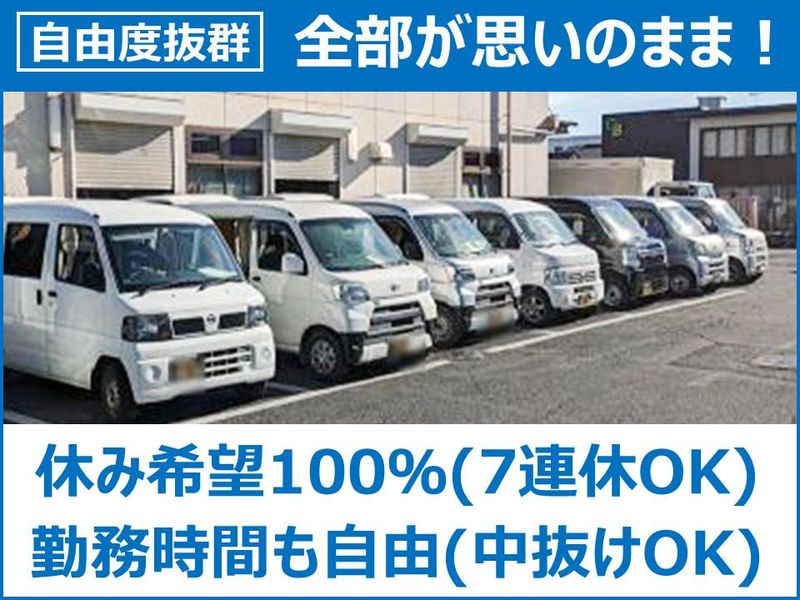 職種/仕事内容 | 仕事内容 9割以上が未経験!自由度高い仕事 どのくらい働く?いくら収入が欲しい? 自分自身でコントロールが可能です! <<ここもポイント!>> ・勤務時間の縛りなし! ・翌月の休みを自分で決められる ・途中で自宅に戻ったり、買い物もOK ・車両トラブル、体調不良… どんな時もスグ駆けつけるサポート体制! <<普通免許でOK!初期費用ゼロ>> ・軽バンのリースあり!車の持込みもOK! ー初月無料|2ヶ月~業界最安級300円/日 ・ガソリンカード貸与 ー給油代の立て替えなし! =================== 【お仕事内容】 <ゆうパックの配達> *直行直帰/伊勢崎郵便局 *境郵便局も同時募集! ・配達地域は伊勢崎市のごく一部。 ・エリアも固定で、毎日同じ。 ・住宅密集地で効率よく配達できる。 ・宅配アプリを使用!土地勘がなくてもOK! [仕事量目安] 1日あたりおよそ80個~120個です。 繁忙期には150個~200個 配達することも可能です。 ==================== 【一人にしない!のが当社のサポート】 1!>聞いてない!をなくす新人研修。 〇1日目:座学研修ー>〇2日目:同乗研修 〇3日目:独り立ち 独り立ち後も管理者が しっかりと付き添います。(目安:2週間) 2!>すぐに駆け付る安心サポート! 急な物量増加や大型荷物、クレーム…。 ”困った” を ”安心”に変えるフォローあり! 3!>情報共有システム整備! 分かりにくい配達先や新築のお宅、 最新のお客様情報、周知事項など、業務に 必要な情報をシステムを通じて全員に共有。 効率的な配達を実現しています! ==================== 【1日通しの場合の仕事の流れ】 07:30頃 :出勤・1便積み込み 08:30頃 :出発・配達 ~ (途中休憩) ~ 12:30頃 :郵便局に戻り、2便積み込み 14:00頃 :出発・配達 ~ (途中休憩) ~ 20:00頃 :業務終了 ・空いた時間に自宅に戻って休憩したり ・家の用事や買い物を済ませたり ・私服に着替えて息抜きに行ったり 自由に時間を使えます! 時間指定や配達ルールを守っていただければ 勤務時間の拘束はありません! |