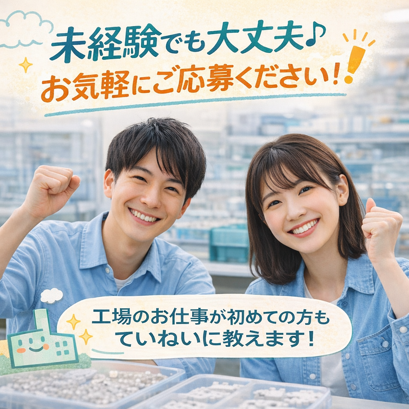 職種/仕事内容 | 仕事内容 ちいさな部品をやさしくチェックするお仕事です。見た目にキズや汚れがないかを確認するだけ♪マニュアル通りに進めるだけなので、未経験さんも安心してスタートできます!工場って怖そう…と思っている方でも、ふんわり優しい先輩がしっかりフォローします |