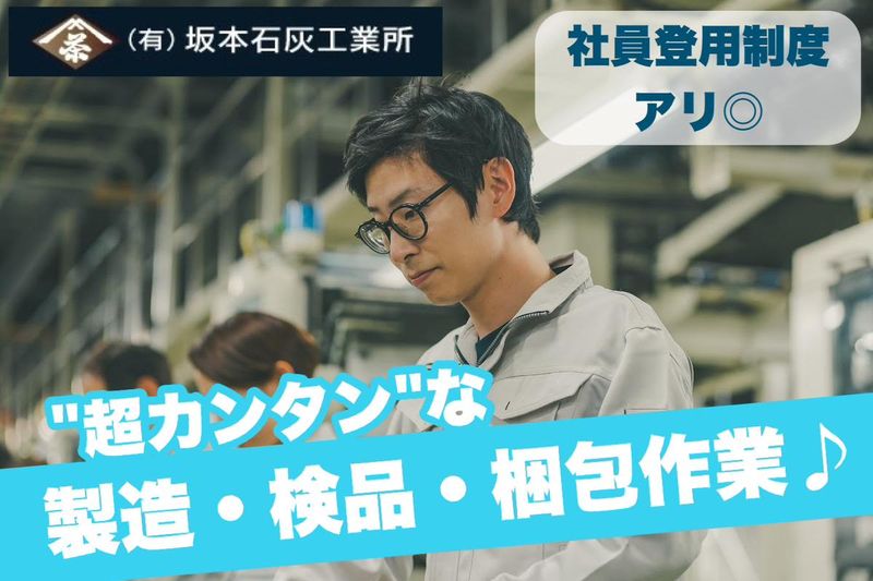 職種/仕事内容 | 仕事内容 \\ 子育て世代にも優しい職場です // 当社は、お煎餅や海苔などの“湿気ると困る” 食品に使われる乾燥剤を製造・販売している 【石灰製品メーカー】です。 創業から70年以上、安定したニーズに 支えられながら今も業績は好調◎ *-* ✅そんな当社では、 2025年7月1日に”女性の新社長”が就任✨ *-* 自身も子育て中ということもあり、 主婦・主夫世代への理解がとても深く、 お子さまの急な体調不良や学校行事など でのお休みにも柔軟に対応しています♪ *-* ✅さらに、同年には社名を 【”株式会社坂本石灰工業所”】へと変更✨ *-* より親しみやすく、 風通しの良い会社へと進化を続けています! このたび、事業好調につき ”増員募集”を行うことになりました♪ *** 【 具体的には・・・ 】 乾燥剤の製造・検品・梱包業務など。 ・機械に資材をセット ・設定を確認し、スタートボタンを押す ・製品に異常がないかチェック ・容器に入った製品の梱包作業 作業はこれだけ! 製造未経験の方でも安心して始められるカンタン作業です。 |