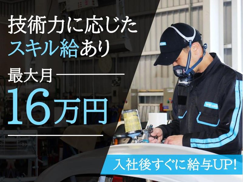 職種/仕事内容 | 仕事内容 □■この求人のPOINT■□ 伊藤忠グループ/2024年5月設立 ◎月給に加え毎月最大16万円のスキル給 *入社後すぐにスキルチェックを実施し、 技術を正当に評価、給与へ反映します。 ◎最新設備で作業効率と安全性を両立 (1人1レーン制/1拠点でフレーム 修正から仕上げまで完結) ◎あらゆるメーカー・ 車種の修復を経験可能 幅広いスキルを習得できます。 ◎学歴関係なく、意欲と実力で リーダーや工場長へ! ◎現場主導のチーム制を導入 若手・中堅問わず、 互いに支え合う文化です。 ◎原則定時退社で残業少なめ 土日は基本休み。 無理なく働ける勤務体制です。 ◎作業ノルマなし。目の前の仕事に 集中できる職場です。 □■お任せするお仕事は■□ 事故や経年によって損傷した車両の 修復を行います。 「お客様の大切な車を、 自分の手でよみがえらせる」 それがこの仕事のやりがいです。 <具体的には> フレーム修正、パネル交換、パテ処理、 塗装仕上げまで修復に関わる工程を、 スキルに応じて段階的に 習得していただきます。 自社基準に沿った技術体系があるため、 品質も安定しやすく、経験が浅い方でも 着実にステップアップできます。 □■充実の工場設備■□ 毎日の清掃と整備を徹底し、 作業しやすく安全な環境を整えています。 「職人任せ」ではなく、 設備・動線・空調・照明まで こだわった職場です。 01. トラバーサーレール 02. キュービックタワー・リフト 03. 床下集塵機システム 04. プッシュプル型塗装ブース 05. 水性塗装 06. 天井吊下式アルティメットヒーター □■充実した研修・教育体制■□ 未経験者でも成長できるように 段階別の研修制度を整備。 現場任せではなく、学びながら 仕事に取り組めるよう支援しています。 <研修の一例> ◎入社時研修 (先輩とマンツーマンで学ぶ) ◎新機構研修 (最新自動車の構造・装置を学ぶ) ◎鈑金修正システム研修 ◎塗装・調色研修 ◎コンプライアンス研修 など □■目指すは日本一■□ 私たちが目指しているのは、 「日本一の鈑金工場」です。 品質はもちろん、お客様が 安心して任せられることを重視。 その一貫として、 国交省の鈑金ガイドラインに基づき、 作業前後の写真撮影などの情報開示を 業界でいち早く開始するなど、 透明性の高い工場運営を行っています。 あなたも一緒に、日本一の工場を 築いていきませんか? ==== 長い目で勤務できる体制 ==== □■評価・報酬について■□ 日々の仕事のがんばりを反映する 評価制度のもと、年齢・社歴に関係なく 平等にチャンスがあります。 (定期的に評価。基本給・賞与へ反映) また、個人の技術と社内資格を 反映させた「スキル給制度」を 導入しています。 ▼ スキル給/月給に加えて最大16万円 ※技術力に応じて支給 <評価例> 【月額スキル給10万円】 ◎パテを使用した軽鈑金作業ができる ◎ボルト止めパネルなどの部品交換ができる ◎下地作業ができる ◎耐スリクリアを含む磨きができる etc. 【月額スキル給13万円】 ◎切換パネル交換ができる ◎骨格修正ができる ◎調色作業ができる ◎内板・外板塗装ができる etc. 【月額スキル給16万円】 ◎大破修理ができる ◎塗装の全工程ができる ◎高品質な作業と人材育成ができる ◎工場長の補佐業務ができる etc. ※上記スキルに加え、個人・店舗目標などの 達成率で総合的に判断いたします。 □■キャリアパス■□ 技術/管理/マネジメントと 多方面のキャリア形成を支援します。 ▼ ◎鈑金塗装の技術を極める ◎希望に応じて管理職を目指す (フロント/工場長/ブロック長) ==== 私たちはこんな会社です ==== □■WECARSについて■□ 私たちは、伊藤忠グループ参画の下、 2024年5月に発足した 中古車販売・買取企業。 現在、 全国で約250店舗を展開しています。 □■WECARSが大切にしていること■□ 1. お客様ファースト (お客様の満足度・納得感の向上) 2. お客様ファーストを実現するための 組織・社員としての成長 3. 信頼される中古車市場の創造をリード ★人事制度改革、 人材育成への取組強化、 コンプライアンス体制構築等の 改革を推進しています。 |