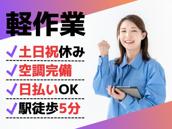 職種/仕事内容 | 仕事内容 ー今回、募集するのは… レンタル医療機器を扱う倉庫での 【軽作業スタッフ】です♪ ~業務内容~ ▼ピッキング・・・指定の商品をピックアップ ▼検品・・・個数チェック(座り仕事) ▼梱包・・・箱に詰める 「倉庫で働くのは初めて…」といった方も大歓迎! シンプルワークだから慣れちゃえば簡単♪ / ここがPOINT★ \ ◎年間休日120日/土日祝休み ◎空調完備!夏も涼しくて快適♪ ◎安治川口駅から徒歩5分! ◎車・バイク・自転車通勤OK ◎定時早め!17:30退社☆ |