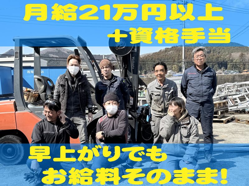 職種/仕事内容 | 仕事内容 【河本商店の紹介】 「非鉄金属のリサイクル事業で 地域に貢献している会社です!」 非鉄金属を回収・買取を行い、 自社で解体・選別・配送し、 新たな資材としてリサイクルしています。 【ここが自慢!】 ◆ワチャワチャしてて とーっても楽しい雰囲気! ◆特に休憩中は、笑い声が絶えないって 言っても過言じゃない(笑) 【約束守ってやることやればOK】 当たり前ですが、 やることはしっかりやってください。 ビシッと言うこともありますが、 逆にそこさえ守ってくれれば、大丈夫! やることやれば、バッチリ楽しく働ける! 「自由だな~」って思うかも知れませんよ。 取引先の企業様からは、 「マジ羨ましいっス」 なんて言われることも多いんですよ♪ そしてそういう会社を目指してました! 【仕事内容】 回収、買い取った非鉄金属の解体・選別業務 重機の運転、配電線処理機の操作、 手作業で解体、選別を行います。 <1日の流れ> 8:00 ラジオ体操、朝礼 8:15 持ち場で業務開始 10:00 15分休憩(実働時間内) 12:00 お昼休み 13:00 業務再開! 15:00 15分休憩(実働時間内) 17:00 業務終了 ※業務内容により、 16:30くらいに終わることもありますが、 その場合でも給与は変わりません♪ <配送は大型車、平均週1~2回程度> 配送は社内ローテーションで行います ★配送は大型車ですが、 最初は普通免許があれば大型免許の 取得を支援します(規定あり) お客様のもとへお伺いして 非鉄金属を回収・買取を行い、 弊社へ運搬します。 【回収エリア】 主に県内及び関東一円 【入社後の流れ】 入社後は、社内のノウハウや 非鉄金属の種類などを覚えながら、 業務をこなして頂きます。 一つずつ知識を覚えていきましょう。 【みんな楽しみの休憩時間】 休憩時間はとにかくにぎやかーっ! お昼休みなどでは、 時には気まぐれに網を敷いて 浜焼きしたりすることも! (自由すぎるって言われる⋯⋯笑) 休憩時間こそ楽しい方が良いよね♪ |