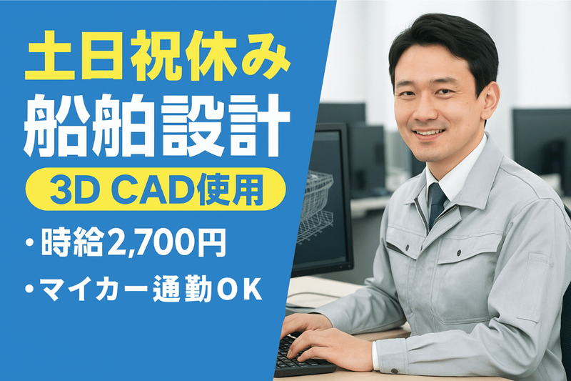 職種/仕事内容 | 仕事の内容 \CAD経験者歓迎!大手造船企業で働くチャンス♪/ ★船舶設計(3D CAD使用)スタッフ募集★ ✨設計業務に集中できる環境◎働きやすさも抜群! ◆仕事内容 船舶製造に関わる設計全般をお任せします。 3D CADソフト(ソリッド系)を使用して、図面作成や強度計算などを行います。 ● 船舶設計に関する図面作成 ● 強度計算、レイアウト設計など ● 使用ソフト:3D CAD(ソリッド系) ★設計スキルやCAD資格を活かして活躍できます! ★丁寧な研修制度あり◎ブランクある方も歓迎♪ ◆勤務地・アクセス 神奈川県横浜市磯子区新杉田町 ▶ JR「新杉田駅」より徒歩25分 ▶ マイカー通勤OK(駐車場あり) ◆勤務時間 8:00〜17:00(実働8時間) ●平日のみ週5日勤務 ●土日祝休み(企業カレンダーによる) ◆給与 時給2,700円 ◆月収例:2,700円×8h×21日=453,600円 ◆待遇・福利厚生 ✅ 各種社会保険完備(健康・厚生年金・雇用・労災) ✅ 日払い・週払い・月払いOK(WEB申請) ✅ 制服貸与/休憩室・ロッカー・自販機完備 ✅ 履歴書不要 ✅ 研修あり/職場見学OK ✅ 敷地内禁煙(喫煙所あり) ◆応募資格 ・CAD資格をお持ちの方 ・3D CAD操作の実務経験がある方は尚歓迎! ・ブランクがある方も研修があるので安心です♪ ✨アピールポイント✨ 船舶の設計に携われる、やりがいあるCAD業務! 3D CAD(ソリッド系)を使用して図面作成・強度計算などを行います。 駅チカ&マイカー通勤OKでアクセスも良好。 高時給2,700円でしっかり稼ぎながら、土日祝休み&17時定時でプライベートも確保◎ 職場環境も整っており、休憩室やロッカー完備! 安定企業で設計スキルを活かして働きたい方にぴったりのお仕事です! ✨求める人物像✨ 「CADのスキルを活かしたい」「船舶設計に関わる仕事がしたい」そんな方におすすめです。 3D CADを用いた図面作成に慣れている方や、設計経験をお持ちの方は即戦力としてご活躍いただけます。 もちろんブランクがあってもOK! 丁寧な研修があるのでご安心ください。 将来を見据えて安定した環境で働きたい方、ぜひご応募ください! |