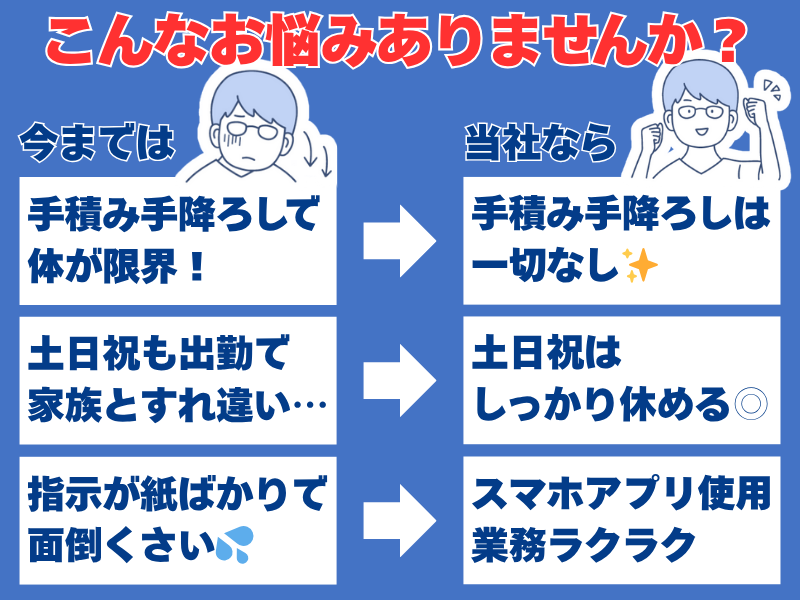職種/仕事内容 | 仕事内容 体の負担もストレスも減らす転職先‼ 月収37万円~&土日祝休 そして手積み・手降ろし作業はナシ◎ 深夜帯~明け方勤務が多いため、 渋滞のストレスなくスイスイ運転可能! 更に、高速道路を使用する事が多め‼ 働きやすさはバツグンです◎ \ ミドル層の転職も応援! / 「運転に集中したい」その想いも 「年齢が不安…」という気持ちも “経験”を活かせる当社で解決できます。 30~40代で同業他社さんから 転職された方が元気に活躍しています! ・・・・・・・・・・・・・・・・・・・・・・・・・・・・・・・・・・・・・・ 【仕事内容・流れ】 大型トラック(ウイング車)での 配送業務をお願いします。 ●富士を出発し、東京方面へ向かう● 約3時間程度の運転です。 前日に積み込んだ荷物(原紙)を降ろす 作業は納品先の方が代行してくれます! ●帰りは古紙積み込みのために 横浜方面等に移動します● 古紙を富士の工場等に荷降ろしし、 翌日に配送する荷物を積み込みます。 運転距離は1日約350~370㎞です。 ●会社に戻り業務終了● 荷物の受け渡し時に書類でのやり取りが あります。 荷積み時はカンタンな検品作業も ありますが、書類に書かれた項目の品番と 数量をチェックするだけです。 ・・・・・・・・・・・・・・・・・・・・・・・・・・・・・・・・・・・・・・ 【当社のココに注目!】 * 手積み・手降ろし作業はありません *トラックは1人1台をおまかせ 過度でなければ車内装飾もOK(要相談) *頑張りは昇給&賞与で反映! ・・・・・・・・・・・・・・・・・・・・・・・・・・・・・・・・・・・・・・ 工数削減と負担軽減に向けDX化に着手! トラックドライバー向けスマホアプリを 使用しています! 目的地、入出庫、日報の管理が全て できるため、業務が少しラクに…♪ アプリは操作もカンタンなので すぐに覚えることができますよ! そんな「働く人のために動く会社」で 新たなスタートをきってみませんか? あなたからのご連絡、お待ちしています‼ ・・・・・・・・・・・・・・・・・・・・・・・・・・・・・・・・・・・・・・ |