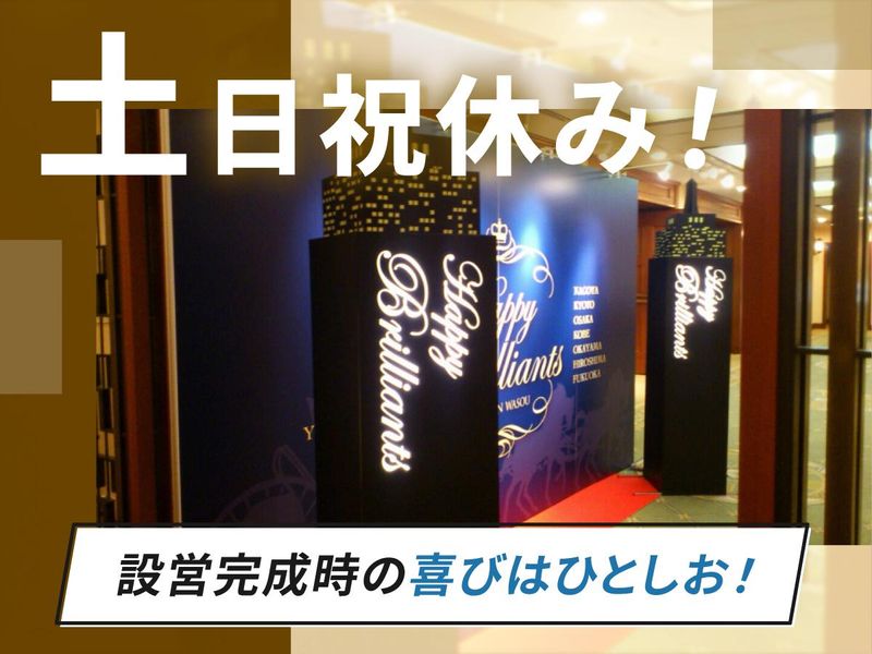 勤務時間 | 固定時間制 勤務時間詳細 実働時間:1日あたり8時間 平均勤務日数:1ヶ月あたり22日 9:30~18:30(休憩1h) ★案件によっては夜に設営などを行います。 その場合は出勤時間を調整するなど、臨機応変に対応します! ★仕事が片付いていれば定時より30分早く終業することも! 【 繁忙期は残業、休日出勤あり 】 バレンタインシーズンの2月、 決算セールが開催される3月、 バーゲンセールが集中している9~11月 などは仕事量も多めです。 残業や夜間の作業、休日出勤を お願いすることもありますが、 その分出社時間を調整したり、 代休の取得/手当支給で対応したりなど 不満なく働ける仕組みを完備。 そうした仕組みづくりも、 定着率の高さに繋がっています! |