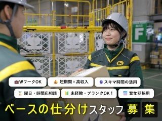 職種/仕事内容 | 仕事内容 【お荷物の仕分け作業】 ベース(大型物流拠点)にて、宅急便などのお荷物をお届けする地域ごと に仕分けして頂きます。ベルトコンベアを利用した作業が中心で、正確さとスピードが求められるお仕事ですが、未経験の方でもすぐに コツをつかんでいただけます。 【仕分け作業の進め方(例)】 ①お荷物をボックスからベルトコンベアに流す。 ②お荷物に記載されている番号を見て、方面別にベルトコンベアからお荷物が流れるレーンに引き込む。 ③レーンにてお荷物に記載されている番号を見て、ボックスに積み込む ※それぞれグループに分かれて作業を行います。 【時間帯ごとの業務例】 <早朝・夕方> 集荷されたお荷物を方面別へ仕分けます。また、配送車への積み込み補助作業をすることもあります。 <深夜帯> 到着した長距離を走るトラック便のお荷物を、方面別に素早く仕分ける作業をします。バーコードを読み取り、行先別にレーンに流し込みます。重いお荷物(米、飲料水、家具など)の取り扱いもありますが、メンバーで協力しながら仕事を進めています。 |
