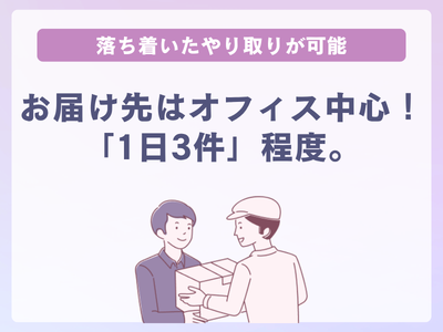 職種/仕事内容 | 仕事内容 お弁当の集荷、法人(主にオフィス)向けの配達・配送をお願いいたします。 1日あたりの配達件数は3件程度です。(稼働のご希望に応じて変動します。) ※配送エリア:東京都23区(ルートによって左記以外のエリアを含む可能性あり) 【業務の流れ】 (1)専用アプリを通じて、配達前日に翌日の配達に関する情報をお送りします。 (2)配達当日、まずはお弁当を集荷します。(飲食店や仕出し弁当屋など) (3)オフィスやテレビ局など法人様向けに配達をします。 (4)予定の配達をこなしたら業務終了!直行直帰のお仕事です。 【くるめし配達ドライバーのポイント】 ●午前のみの勤務だから、午後はまるっと自分時間! 無理なく続けたい方におすすめの働き方です♪ ●「午前中3時間」の稼働で6,600円の支給なので、時給換算で2,200円! 早く配送が終わっても支給額は保障されるので、圧倒的に効率よく稼げるお仕事です♪ ●配達件数も少なく、ほとんどが法人向けだから余計なクレームもなく、 配達業務に集中できます。 ●駐車場代や高速代は会社が負担します◎ ●働く日数は、最低「月2日~」OK!業務に慣れた後に徐々に日数を増やすなど ご自身の生活リズム・ペースに合わせてお仕事ができますよ。 ●万が一トラブルがあっても、コールセンタースタッフが 待機してるから気軽に相談できる環境です。 ●請求書作成も会社で代行しますので、ドライバー業務に集中していただけます◎ 【ご応募後の面談について】 業務内容や条件について誤解のない状態で稼働いただけるよう、 ご来社いただいての面談を予定しております。 ※面談内容は、これまでのご経験やご希望の働き方をお伺いしつつ、 具体的な業務の流れとイメージ、報酬や稼働開始までの流れについて 直接ご説明させていただく場となります。(30分程度を予定しております) ご不明点等あれば、その場でぜひご質問ください。 ※ご都合が合わなくなった場合は、面接前までにご連絡いただければ 日程変更させていただきますのでお気軽にご相談ください! <オンライン面談ご希望の方へ> ①ご応募確認後メール・SMSにて日程調整のご連絡をさせていただきます。 ②まずは上記の日程調整にご回答いただき、その後メールにて オンライン面談希望の旨を弊社までご連絡ください。 ③弊社よりオンライン面談用のリンクを発行し、メールにてお送りさせていただきますので 面談当日に接続をお願いいたします。 【株式会社くるめしについて】 「くるめし弁当」は、日本最大級の法人向け弁当デリバリープラットフォームです。 当社は「働く人の食生活をもっと豊かに」をコンセプトとし、 顧客体験を最重視したサービス運営を行っています。 法人向け食事デリバリー市場において国内最大規模を誇り、 インターネットを活用した食事発注・デリバリーサービスの先駆者として、業界をリードしています。 |