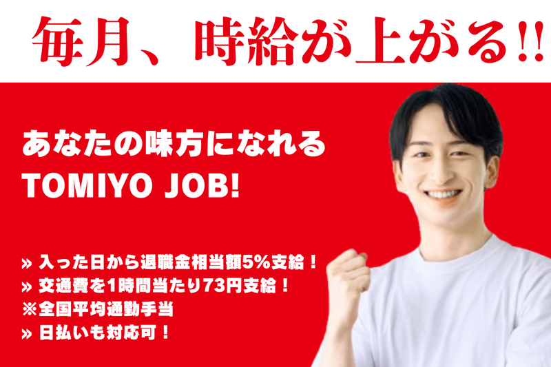 選考プロセス | ■応募後の流れ *【 ご応募・お問合せ 】* 「応募画面へ進む」ボタンからカンタン1分応募 氏名、メールアドレス、電話番号などを入力して応募完了! 求人のお問い合わせだけでも構いません、 お気軽にご連絡下さい! ━━━━━━━━━━━━━━━━━━━━━ *【 応募後の流れ・選考プロセス 】* 1.Indeedから応募 ↓ 2.求人の詳細などご連絡させていただきます。 ※ご質問がございましたら遠慮なくお申し付けください。 ↓ 3.面接(リモートOK)、職場見学も可能です。 ↓ 4.内定・入社 ※応募~内定まで最短で即日、 通常では1週間程度を予定しています。 ※入社日も相談に応じますので、お気軽にご応募ください!! ////////////////////////////////////////// 「この求人、なんだか違う気がする…」 「自分に合っているかどうかわからない…」 など、少しでも不安や疑問がある方へ。 TOMIYO JOB!では、皆さまにピッタリの お仕事を無料でご紹介しています。 まずはお気軽にご連絡ください! 【お問い合わせ先】 株式会社TOMIYO JOB(トミヨジョブ) TEL:0120-1034-67(平日9:00~18:00) ━━━━━━━━━━━━━━━━━━━━━ <TOMIYO JOB!ならうれしい特典がいっぱい> POINT1:毎月、時給が2円ずつ上がり続ける! POINT2:入社したその日から退職金相当額5%を支給 POINT3:交通費を1時間当たり73円支給 POINT4:希望の方には日払いも対応可能! ※1stエントリー対象の方は、POINT1(毎月2円昇給)が適用されませんのでご注意ください。 \動画でTOMIYO JOB!を知る/ https://youtu.be/UMLrzteO3X0 ━━━━━━━━━━━━━━━━━━━━━ 【 事業内容 】 労働者派遣事業、有料職業紹介事業 ※労働者派遣事業 許可番号/派 40-010237 ※有料職業紹介事業 許可番号/40-ユ-010110 ━━━━━━━━━━━━━━━━━━━━━ ■応募受付電話番号 092-471-1034 ■個人情報の取扱いについて ご提供いただいた個人情報は、採用選考及び結果等の通知・連絡の為に利用いたします。 それ以外の利用目的または法令等に基づく要請の範囲を超えた利用はいたしません。 |