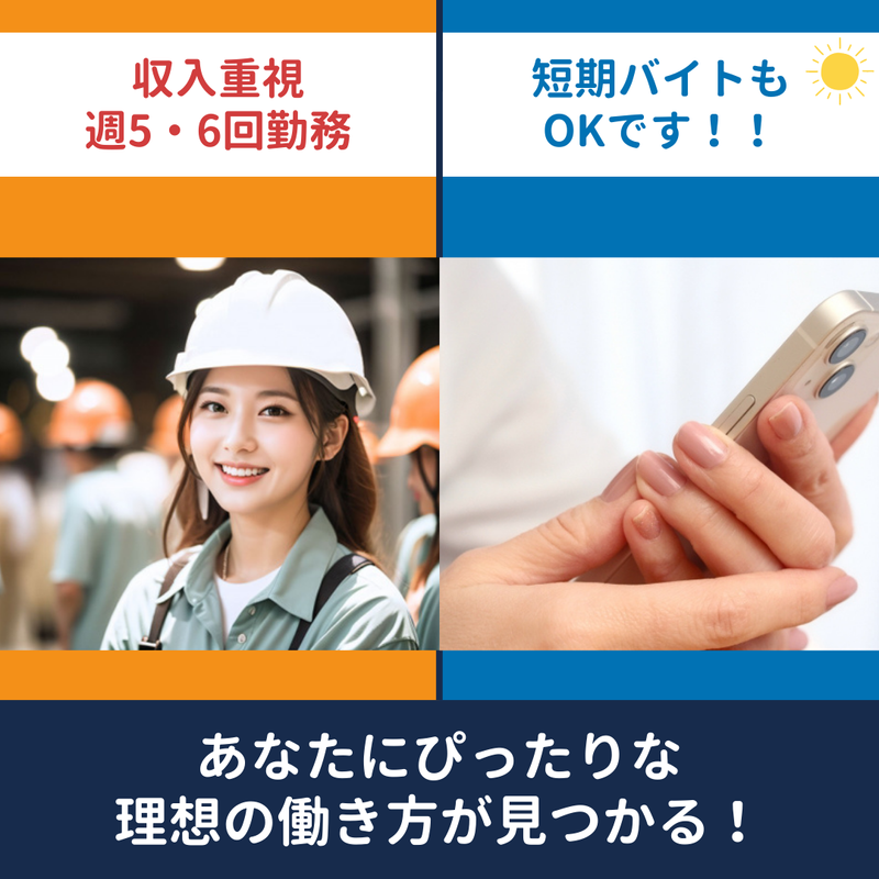 職種/仕事内容 | 仕事内容 日給も1万500円にアップ!! 週6日勤務できる方は日給1万3000円! \ 未経験OK! / 建築関係のお仕事! 異業種でも活かせる経験多数☆彡 【仕事内容】 工事現場での作業 <具体的な作業> 土木・解体工事現場にて 雑工事・片付け・清掃作業 【現場エリア】 神奈川県内や東京近郊になります。 (交通費は現場までの移動分支給) ※電車通勤30分以内アクセス※ 【八王子方面】 八王子駅、橋本駅、相原駅、 八王子みなみ野駅、片倉駅 【東神奈川方面】 矢部駅、淵野辺駅、古淵駅 町田駅、成瀬駅、長津田駅 中山駅、鴨居駅、小机駅 新横浜駅、菊名駅 【日払いOK】 お金にピンチでも安心の 寮完備&日払い制度あり!! <活かせる経験やスキル> ✅倉庫内作業 ✅機械製造オペレーター ✅トラックドライバー ✅施工管理・現場責任者 ✅清掃スタッフ ✅引越し作業 ✅普通自動車免許 など、活かせます✨ |