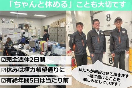 職種/仕事内容 | 仕事内容 船橋支店は何といっても人間関係がいい! ◆おしゃべり好きの方が多いです ◆世話好きな方も多いです ◆上下関係はあまりありません ◆30代~50代まで幅広く活躍中! ◆未経験スタートの方も数多く在籍しています ┗中型免許取り立ての方もOK! 休みはできるだけご希望に合わせます ◆完全週休2日でゆっくり休養してください ◆有給休暇年間5日間取得は当たり前です ┗頑張ってドライバーさんのご希望に応じています 具体的な仕事内容はこちら ◆物流センター間輸送(1日2便ですぐ覚えられます) ◆1日の走行距離は150Km程度(コースによる) ◆運ぶものは冷蔵生鮮食品、又は常温品です ◆深夜の運行では渋滞等のストレスもありません! ◆乗車するトラックは固定です ┗ほとんどカスタムはできませんが・・・ 充実した研修と安全への取り組み ◆未経験でも安心の充実した研修制度! ┗座学研修や同乗研修(2~3週間)など ◆従業員の安全第一! ┗「働きやすい職場認証」「Gマーク」取得済! ┗ドライブレコーダー、衝突軽減ブレーキ完備 ◆4t車でもオートマチック車を配置 ┗8t限定、AT限定免許でも4t車に乗務できます! ◆運行管理者資格などの資格取得支援制度あり ◆コンプライアンスにも力を入れています 当社が超安定しているワケは・・・ ◆東証プライム上場のSBSグループだから安定・安心! ┗日本の陸運トップ10に入る売上規模です ◆食品×物流=バツグンの安定性 ┗生活に欠かせない食品を運ぶという重要なインフラを担っています ◆各種福利厚生も充実しています |