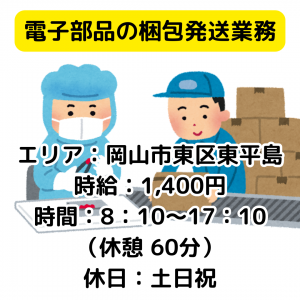 職種/仕事内容 | 仕事内容 今回のお仕事は、平島地区で コネクターを組立てる設備を 使用しての製品製造です。 ◎精密機器の為、細かい部品を扱う作業もありますが その分重量物はなく、体への負担が少ないお仕事です! ◎未経験の方でも丁寧に教えて頂けます! ◎岡山倉敷総社地域からのアクセスも◎ ◎入職前から入職後も、担当営業が しっかりサポートしてくれるので フォロー体制万全のもと就業できます! ◎日払い・週払い制度もあります(社内規定有) お給料日まで不安という方も 安心してお仕事を始められます! ~資格もスキルもないから自信がない、という方へ~ 実は工場・製造ワークをしている方の80%は未経験スタート。 コツコツ作業が好き、実は、集中して作業するのが得意。 更にいつも一歩先を考えながら仕事をしていた接客業経験者は 仕事にすぐに慣れて、職場で必要とされる人になるはずです。 |
