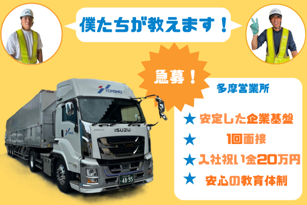 職種/仕事内容 | 仕事内容 =============== 高収入!毎日日帰りOK!! ■入社祝い金20万円支給! ■資材の固定ルート配送! ■手積み・手降ろし無し! =============== ①25tトレーラードライバー(ウイング) 月給40万円~ ②15tトラックドライバー(ウィング) 月給37万円~ トラックは、全車デジタコ・ドライブレコーダー搭載車、バックアイモニター付き。 4:00~16:00の内で実働8時間シフト制 要:大型自動車免許・牽引免許 ◆借り上げ社宅制度など待遇充実! ※詳細は下記ご覧ください! 【この仕事の魅力】 ◆毎日日帰りできる! 長距離運転することがないから、毎日日帰り。 長時間の勤務で集中力が切れて事故に・・・ なんて危険な働き方は絶対ありません! お昼ご飯を食べられる余裕もしっかりあります。 15時上がりの時もありますよ! ◆トラックは一人一車制! 全車デジタコ・ドライブレコーダー搭載車、 バックアイモニター付きなので安心! やっぱり自分専用のトラックがあるのは嬉しいですよね! 【仕事内容】 石こうボードという建築用資材を、 荷主様の工場から、自社倉庫へ定期便輸送を行っていただきます。 基本は1日あたり、1~2便の運行となります。 運行回数を増やすことで、更なる収入アップも見込めます! ◆積み込み・積み下ろしは作業はフォークリフトを用いて行います。 (フォークリフトの免許取得支援制度あり) ◆「もっと稼ぎたいから多めに」といった要望もOKです! 2024年問題で収入が減少してしまった現役ドライバーさんも大歓迎です! ━━━━━━━━━━━━━━━━━━━ 【働きやすくしっかり稼げる職場】 先輩ドライバーの方はみんな優しく教え好き(笑) 経験の少ない方も丁寧な指導で、一人前のプロドライバーになれます! 経験者優遇&未経験者歓迎!免許取得支援制度もあるので、資格がない方でも安心して始められます。有給休暇も取りやすく、家族との時間や旅行などプライベートも充実可能です。 「もっと稼ぎたい」「初心者だから少なく」など、配送件数の相談もOKです! ==================== 【創業60年のトーショーグループに関して】 1964年の創業から60年と長く安定している業界有数の運送会社です。 全国各地で事業を展開。 現時点でグループ全体で34拠点を有し、社員数は800名以上。 大手荷主とお取引が多く、取り扱う商材等の関係から仕事量が安定しています。 また物流だけでなく、旅客や引っ越し、 保険・物販といった多種多様な事業も展開しております。 【株式会社トーショーに関して】 そんな数多くの事業を手掛けるトーショーホールディングスにおいて、 当社は大手建材メーカーの建築資材の配送・倉庫管理を担っております。 日夜変化を遂げる物流業界に対応するため、 環境問題、安全への取り組みはもちろんのこと、 最新の情報システムによる効率化など、 お取引いただくお客様だけでなく 従業員も安心して勤務できる環境を実現しております。 当社ホームページ: https://www.tohsho-gr.co.jp/company/tohsho/ 採用ホームページ: https://www.tohsho-gr.co.jp/recruit/ ≪転職を迷っている方も気軽にご相談ください!≫ ■株式会社トーショー 多摩営業所 勤務地:東京都西多摩郡瑞穂町殿ケ谷722−2 お車での来社もOKです。 お電話での応募もお待ちしております。 【TEL:042-476-3300】 |