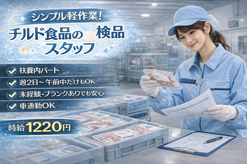 職種/仕事内容 | 仕事内容 中央卸売市場内にあるチルド倉庫で、入荷した商品の検品作業をお願いします。届いた商品(チルドの食品)に破損や異常がないかを目で見てチェックし、リストと照らし合わせて確認していくお仕事です。作業はとてもシンプルで、体に負担が少なく、コツコツ丁寧にこなせればOK!重たいものを持つ作業はほとんどなく、未経験の方やブランクがある方も安心して始められます。 「久しぶりに働いてみたい」「短時間だけがいい」「扶養内で調整したい」という方にぴったりの環境♪ お子さんのお迎えや家事とも両立しやすく、働き方の相談も気軽にできますよ。13時までの勤務も可能です◎ #ブランクOK #短時間勤務OK #扶養内OK #簡単コツコツ軽作業 #女性活躍中 #服装・髪色自由 |