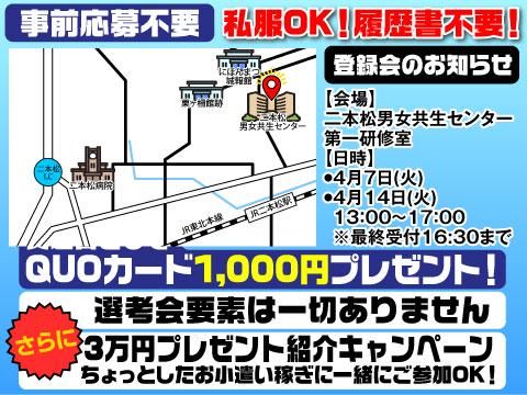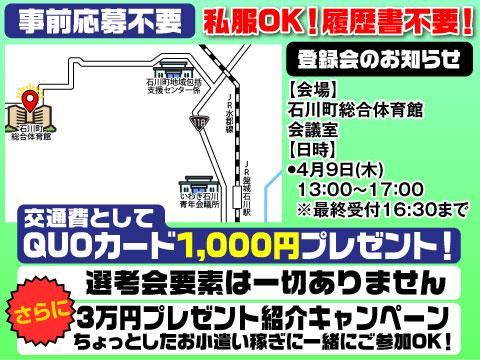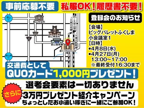 待遇・福利厚生 | 【保険制度】 雇用保険、労災保険、健康保険、厚生年金 【福利厚生】 待遇・福利厚生 【福利厚生】 ・社会保険完備(入社日当日より加入) ・交通費支給(ガソリン代含む) ・正社員登用制度あり ・週払い制度あり ・有給休暇制度 ・制服貸与 ・食堂・駐車場完備 ・友人紹介制度(紹介手当あり) ・入社祝金支給(期間限定/最大5万円) ※各種規定あり ■私服OK・履歴書不要の登録会■ 仕事内容の説明を中心とした案内です。 応募前に内容を確認できます。 ◎ 担当者とざっくばらんに話せます ◎ 仕事帰りの私服OK・手ぶらでOK ◎ 所要時間:約1時間(履歴書持参なら30~40分) ★ 参加特典:QUOカード1000円分プレゼント! 【日程】 4月7日(火) 13:00~17:00 場所:二本松男女共生センター 第一研修室 住所:福島県二本松市郭内一丁目196-1 4月8日(水) 13:00~17:00 場所:ビックパレットふくしま 小会議室1 住所:福島県郡山市南2丁目52番地 4月9日(木) 13:00~17:00 場所:石川町総合体育館 会議室 住所:福島県石川郡石川町字渡里沢296‐8 4月14日(火) 13:00~17:00 場所:二本松男女共生センター 第一研修室 住所:福島県二本松市郭内一丁目196-1 4月27日(月) 13:00~17:00 場所:ビックパレットふくしま 小会議室1 住所:福島県郡山市南2丁目52番地 <お友達紹介キャンペーンも実施中!> 紹介した方が1ヶ月続くと、 紹介者に現金3万円プレゼント! (年間6名まで紹介OK) |