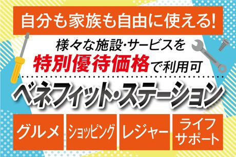 待遇・福利厚生 | 【保険制度】 雇用保険、労災保険、健康保険、厚生年金 【福利厚生】 待遇・福利厚生 【福利厚生】 ・社会保険完備 ・昇給有 ・週払いOK(規定) ・有給休暇 ・制服貸与/制服通勤もOK ・交通費全額支給 ・バイク通勤OK(ガソリン代補助) ・食堂、仕出し弁当有 ・無料の無線LAN有 ・夏場は飲み物支給 ・直接雇用実績あり ・喫煙室あり ・結婚祝金、出産祝金、扶養こども手当、入学祝金、弔慰金、退職金制度などの福利厚生が充実(規定) ・紹介キャンペーン ※ご紹介くださった方1名につき5万円を進呈(規定) 【ベネフィット・ステーションの利用が可能】 ベネフィット・ステーションとは、 様々なシーンでご利用いただける 総合型福利厚生サービスです。 映画鑑賞やホテルディナー、宿泊施設 などの余暇・レジャー関連をはじめ、 日常で使えるフィットネスや 育児・介護支援、ライフサポートなど 約140万件以上の幅広いメニューを お得な価格で利用できます。 <サービス例> ・全国40,000以上の宿泊施設 ・全国30,000店舗以上の飲食店 ・全国約7,700ヶ所のスポーツクラブ など スタッフさんはもちろん、ご家族の方もお好きなだけ利用できます。 |