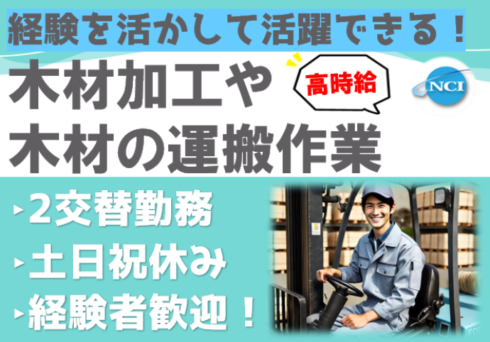職種/仕事内容 | 仕事内容 【機械オペレーター・木材の運搬】 住宅に使用する木材の加工、運搬を行います。 具体的な作業内容は‥ ・木材を機械へセット ・加工が終わった木材の検査、包装 ・梱包した製品をフォークリフトで運搬 ※フォークリフトはカウンタータイプを使用します。 / ★フォークリフト資格を活かせるお仕事!! フォークリフトを使用した運搬があるので資格必須です! 運転の難易度はそこまで高くないのでブランクがあってもOK! \ ○2週間ごとの交替勤務!! 交替勤務ですが土日を挟んでの2週間ごとになるので生活リズムを崩しにくく安心! 高時給で交替勤務なのでしっかり稼げます!! ◯嬉しい土日祝休み! 家族や友人との予定も立てやすい♪プライベートも充実! ○お弁当の注文可能! 毎日のお昼ご飯等のお弁当注文が可能です! |