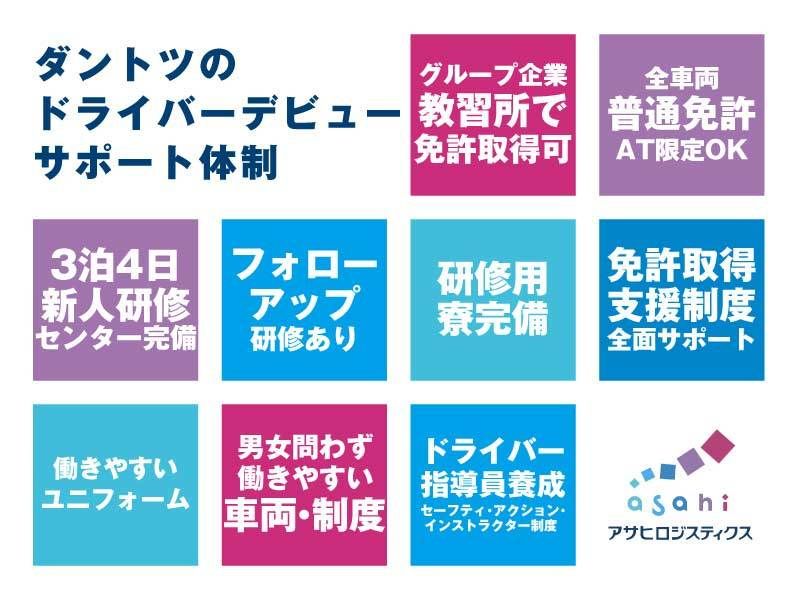 PR 全車AT+未経験者多数 業界でも珍しく、全車AT対応 異業種からの転職者が多く、未経験スタートでも安心です 自社独自の研修センター完備 S字や縦列駐車など、教習所以上に実践的な練習ができます グループで自動車学校も運営しており、 資格取得~実践まで一貫サポートします 社員を表彰する制度充実 なんと1等賞は「新車」や「ハワイ旅行」など大盤振る舞い? “社員がイキイキ働けることが、お客様満足につながる”という考えから生まれました。 女性ドライバー定着率75%以上 全国で220名以上の女性が活躍中。 意見を反映して設計された専用車両「クローバー」は、 着替えのストレス軽減カーテンなど女性目線の工夫が満載。 定着率は75%以上 公式ホームページ https://www.asahilogistics.co.jp/ ◆弊社の現職社員の口コミもメディアにまとめました。 ポジティブな声もネガティブな声も包み隠さず、リアルに発信しております。 https://www.shain-voice.com/corporate/94 ◆アサヒロジスティクスについてマンガで紹介 https://drive.google.com/file/d/1Cm35aEVEY6ty4sZZk7NnEVQcJXRWZJov/view?usp=sharing
