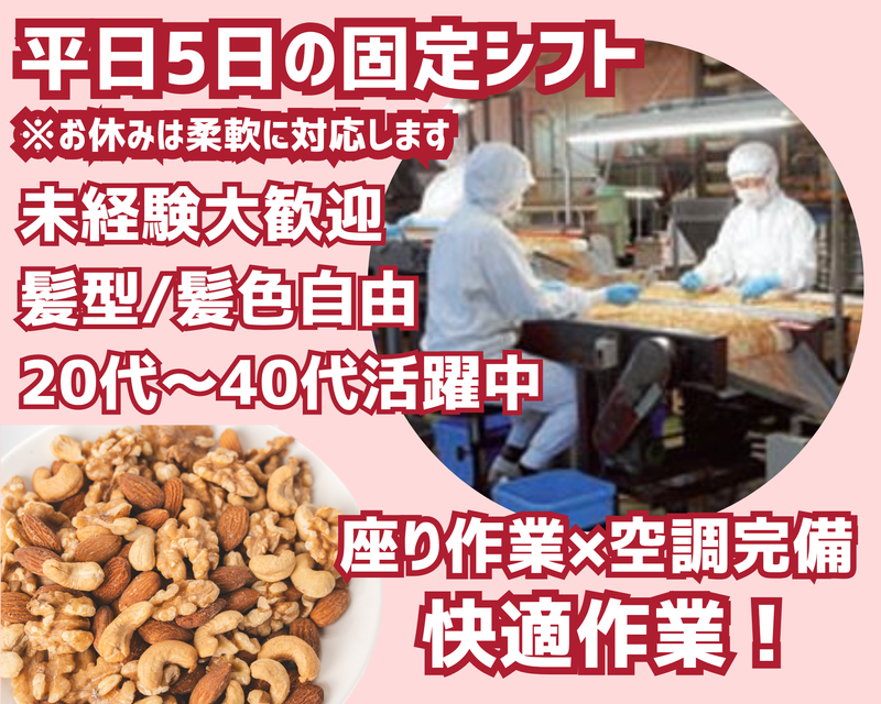 職種/仕事内容 | 仕事内容 ■ この求人のポイント ======================= 食品工場内で行う、検品・選別中心の軽作業です。 20代・30代・40代の女性スタッフが、 平日週5日・フルタイムで安定して活躍中! ✅土日祝休み/生活リズムが整う ✅力仕事なし・座り作業中心 ✅空調完備の清潔な工場内作業 ✅未経験OK(丁寧な研修あり) ✅固定時間勤務で予定が立てやすい ✅勤務前の職場見学OK 長く安定して働きたい方に向いた環境です。 ======================= ▼ 仕事内容 ▼ ー 食品原料(ナッツ類)の検品・選別を行う 軽作業スタッフのお仕事です。 製菓食品ナッツ素材メーカーの工場内にて、 工場内サポート業務として、以下の作業を担当します。 ・ナッツの目視チェック(検品) ・仕分け・袋詰め・梱包 ・作業エリアの簡単な清掃 ※専門的な機械操作や力仕事はありません。 ▼ 具体的には?▼ ベルトコンベアーで流れてくる ピーナッツ・くるみ・アーモンドなどを確認し、 形が不揃いなものや、色味が異なるものを 目視で選別します。 冷暖房完備の環境で、座り作業が中心のため、 体への負担が少なく、集中してコツコツ働けます。 ▼ 働きやすい環境 ▼ ー ✅女性リーダー在籍で相談しやすい ✅家庭事情による早退・お休み相談OK ✅休憩室完備(冷蔵庫・電子レンジあり) ✅ウォーターサーバーあり/お弁当持参OK 慣れてきた方は、 希望に応じて早出・残業の相談も可能。 週5日しっかり働きたい方にぴったりです。 ▼ こんな方におすすめ ▼ ー ✅平日フルタイムで安定して働きたい ✅未経験から始められる仕事を探している ✅体に無理のない軽作業がいい ✅地元で長く続けられる職場を探している |