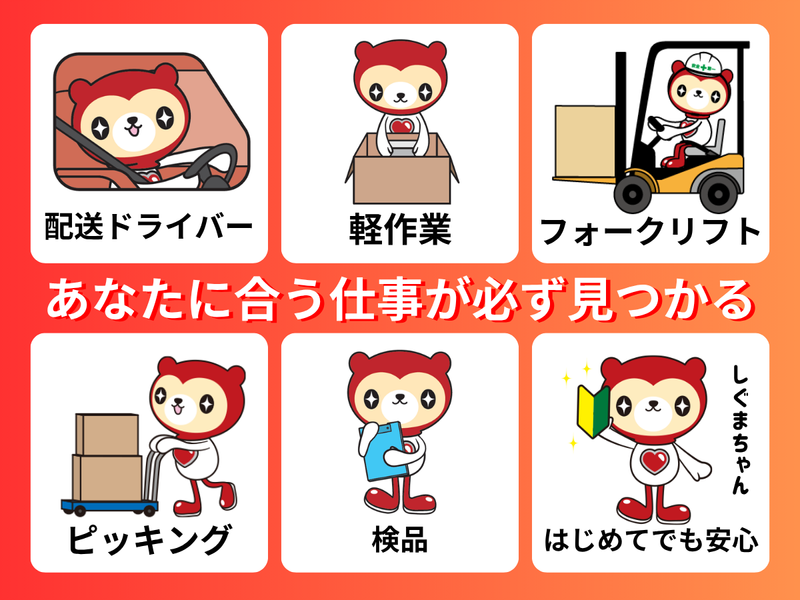 職種/仕事内容 | 仕事内容 <<おすすめポイント>> ★運転免許は不要!助手席に乗るだけ! ★時給1100円でしっかり稼げる ★週休2日制でプライベートも充実 ★未経験OK!20代〜40代男性活躍中 ★嬉しい日払い・週払いOK! ★制服・安全靴・携帯など備品貸与 <お仕事内容> 有名飲料メーカーのトラックに同乗し、 自動販売機への商品補充のサポート。 運転業務は一切ありません! ・商品のピッキング・積み込み ・自販機への商品補充・清掃 ・空き缶の回収 (トラックへの積み込みなど) ・配送ルートのサポート ドライバーが料金計算をしている間に、 商品の補充や空き缶回収を ササッと進めるチームプレイです。 適度に体を動かすので、 「じっとしているより動きたい」 「ジム代わりに働きたい」 という方にピッタリ! / 20代〜40代の 男性が活躍中! \ 【シグマロジスティクス株式会社について】 物流・製造に特化した人材派遣サービスを 展開しています。高時給で高収入が目指せる お仕事もたくさんご紹介しております。 【お電話での応募はこちら】 TEL: 092-292-8077(平日9時~18時) |